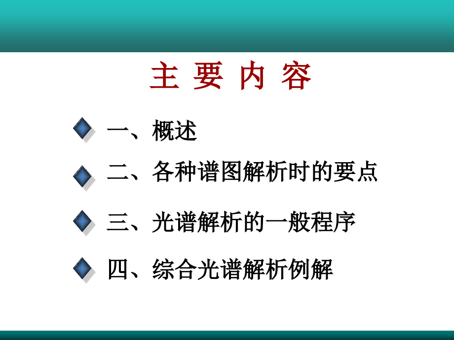单击此处编辑母版标题样式,单击此处编辑母版文本样式,第二级,第三级,第四级,第五级,2020/4/18,#,谱 图 综 合 解 析,二、各种谱图解析时的要点,三、光谱解析的一般程序,一、概述,主要内容,四、综合光谱解析例解,一、概述,紫外、红外、核磁(氢谱、碳谱、二维谱)、质谱。,“四大波谱”,对于比较复杂的有机化合物的结构测定(如天然产物),需要综合各种波谱数据和理化性质进行结构推导,确定化合物结构。,综合解析,二、各种谱图解析时的要点,1,UV,法:,主要用于提供分子的,芳香结构,和,共轭体系,信息,横坐标:波长(,);,纵坐标:吸光度(,A,);或摩尔吸光系数(,)。,二、各种谱图解析时的要点,1,UV,法:,(,1,),220-800nm,内无紫外吸收,说明是脂肪烃、脂环烃或其简单衍生物(氯化物、醇、醚、羧酸等),甚至可能是非共轭的烯。,(,2,),220-250nm,内显示强的吸收(,近,10000,或更大),这表明,K,带的存在,即存在共轭的两个不饱和键(共轭二烯或,、,不饱和醛、酮)。,(,3,),250-290nm,内显示中等强度吸收,且显示不同程度的精细结构,说明苯环或某些杂芳环的存在。,(,4,),250-350nm,内显示中、低强度的吸收,说明羰基或共轭羰基的存在。,(,5,),300nm,以上,有高强度的吸收,说明该具有较大的的共轭体系。若高强度吸收具有明显的精细结构,说明稠环芳烃、稠环杂芳烃或其衍生物的存在。,主要用于提供分子的,芳香结构,和,共轭体系,信息,二、各种谱图解析时的要点,2,IR,法:,判断分子中所含有的,特征官能团,和,化学键,的类型,二、各种谱图解析时的要点,2,IR,法:,判定结构中含氧官能团的存在与否(特别是结构中不含氮原子时,非常容易确定,OH,、,C=O,、,C-O-C,这几类官能团的存在与否)。,判定结构中含氮官能团的存在与否(非常容易确定,NH,、,CN,、,NO,2,等官能团的存在与否)。,判定结构中芳香环的存在与否。,判定结构中烯烃、炔烃的存在与否和双键的类型,。,判断分子中所含有的,特征官能团,和,化学键,的类型,红外光谱的九大区域,(一),O-H,、,N-H,伸缩振动区(,37503000cm,-1,),(二)不饱和烃和芳烃,C-H,伸缩振动区(,33003000cm,-1,),(三)饱和烃,C-H,和醛基,C-H,伸缩振动区(,30002700cm,-1,),(四)叁键的对称伸缩振动区(,24002100cm,-1,),(五)羰基的伸缩振动区(,19001650cm,-1,),(六)双键的对称伸缩振动区(,16801500cm,-1,),(七),C-H,面内弯曲振动区(,14751300cm,-1,),(八)单键(,C-O,、,C-X,)伸缩振动区(,13001000cm,-1,),(九)不饱和,C-H,面外弯曲振动区(,1000650cm,-1,),3,MS,法,二、各种谱图解析时的要点,分子离子峰,(,1,)图谱中,质量数最大,的离子峰(最右端);,(,2,),奇电子离子,;,(,3,)与左侧的离子峰有,合理的中性碎片,(自由基或小分子)丢失,这是判断该离子峰是否是分子离子峰的最重要依据。,(,1,)从分子离子峰及其同位素峰确定分子量、分子式。,基峰:,质谱图中离子强度最大的峰,,规定其相对丰度为,100,。,基峰,分子离子峰,3,MS,法,(,2,)含氮原子的推断(氮规则、断裂形式)。,由,C,,,H,,,O,组成的有机化合物,,M,一定是偶数。,由,C,,,H,,,O,,,N,组成的有机化合物,,N,奇数,,M,奇数,。,由,C,,,H,,,O,,,N,组成的有机化合物,,N,偶数,,M,偶数,。,(,3,),CI,、,Br,等的鉴定(从,M+2,、,M+4,峰)。,二、各种谱图解析时的要点,(,4,)由简单的碎片离子,推测官能团及结构片段。,二、各种谱图解析时的要点,4,1,H-NMR,法:,(,1,)根据积分曲线的数值推算结构中质子数。,溶剂,DMSO-d6,,,500 MHz,二、各种谱图解析时的要点,4,1,H-NMR,法:,(,2,),区分羧酸、醛、芳香族、烯烃、烷烃质子。,二、各种谱图解析时的要点,4,1,H-NMR,法:,(,3,),根据自旋偶合裂分判定基团的连接情况。,AAXX,系统,CDCl,3,,,300 MHz,二、各种谱图解析时的要点,4,1,H-NMR,法:,(,4,),根据自旋偶合作用研究其相邻的取代基。,二、各种谱图解析时的要点,4,1,H-NMR,法:,(,5,)根据峰形判定结构中活泼质子的存在与否,-OH,:,醇、酚和羧酸的质子交换速度很快,通常在谱图中呈现尖锐的峰。当存在氢键缔合时,质子交换速度变慢,会呈现锐峰,甚至“馒头峰”,它们的化学位移值都有较大的变化范围。,尖锐的峰 馒头峰,二、各种谱图解析时的要点,4,1,H-NMR,法:,(,5,)根据峰形判定结构中活泼质子的存在与否,-NH,:,一级和二级胺多为尖的峰。在酸性溶液中胺成盐后,铵离子的质子交换速度大为降低,,-NH,变为宽峰,甚至出现裂分。,酰胺的,-NH,一般在,5.0-8.5ppm,出现宽峰。如氯代乙酰胺,在,7.3-7.6ppm,处出现两个宽的,NH,2,峰。,a,b,a,b,二、各种谱图解析时的要点,5,13,C-NMR,法,(,1,)判断碳原子个数及其杂化方式(,sp,,,sp,2,,,sp,3,),杂化状态是影响碳核化学位移的主要因素,一般来说它,与该碳上氢的位移次序基本平行,。,二、各种谱图解析时的要点,5,13,C-NMR,法,(,2,)根据化学位移值判定羰基的存在与否及其种类。,羰基化合物的,C,在很低场(,160 220 ppm,),且干扰很少。,饱和醛和酮的羰基,C,195 ppm,;,羰基与杂原子(具有孤对电子)或不饱和基团相连,,p-,共轭,电子云密度增大,共振移向高场方向,,150 185 ppm,。,酰氯、酰胺、酯、酸酐、羧酸,C,(叔碳),(仲碳),三、光谱解析的一般程序,1,测试样品的纯度,(,1,)测定物理常数:沸点、熔点、折光率。,(,2,)色谱法:,TLC,、,GC,、,HPLC,。,三、光谱解析的一般程序,2,分子量或分子式的确定,(,1,)经典的分子量测定方法,元素分析法,(,2,)质谱法,高分辨质谱在测定精确分子量的同时,还能推出分子式。低分辨质谱由测得的同位素丰度比也可推出分子中元素的组成,进而得到可能的分子