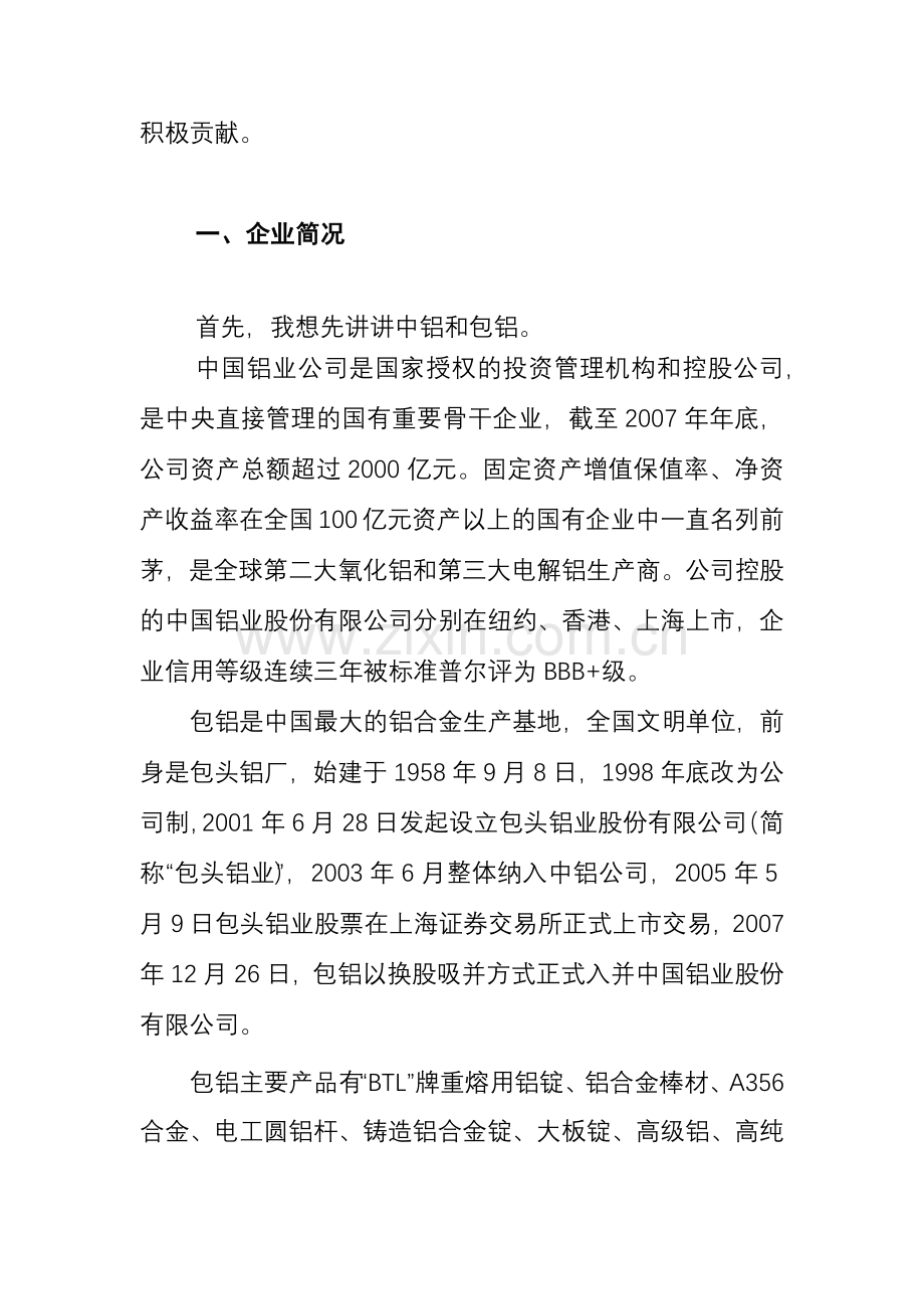 同志们好!首先要感谢各位和培训中心给我这个机会,有幸同大家探讨企业文化的问题,共同学习《员工手册》包含的企业文化理念、企业精神以及企业战略目标,为大家介绍企业视觉识别系统规范应用等方面的问题,分享中铝包头企业的文化理念,以便在今后的工作当中运用、思考和交流,不妥之处请大家及时指正。