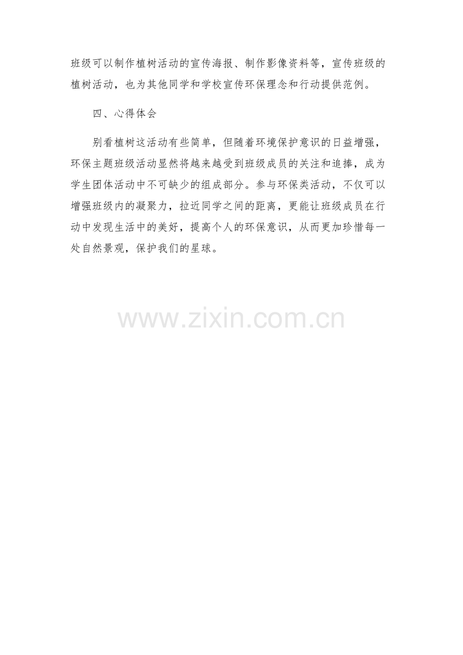 在植树活动结束时,班级可以适合地开展一些反馈座谈和总结的活动,大家可以畅所欲言,分享各自的体验和感受。座谈结束后,班级可以制作植树活动的宣传海报、制作影像资料等,宣传班级的植树活动,也为其他同学和学校宣传环保理念和行动提供范例。