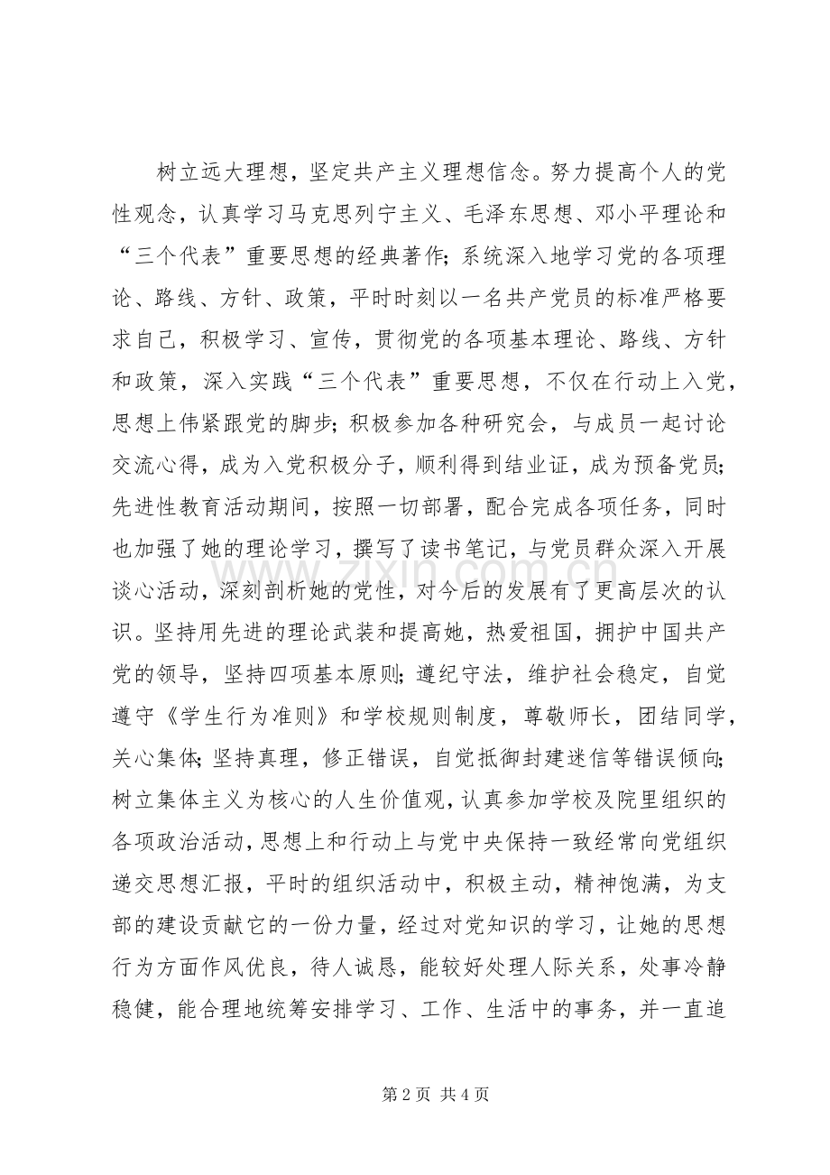 树立远大理想,坚定共产主义理想信念。努力提高个人的党性观念,认真学习马克思列宁主义、毛泽东思想、邓小平理论和“三个代表”重要思想的经典著作;系统深入地学习党的各项理论、路线、方针、政策,平时时刻以一名共产党员的标准严格要求自己,积极学习、宣传,贯彻党的各项基本理论、路线、方针和政策,深入实践“三个代表”重要思想,不仅在行动上入党,思想上伟紧跟党的脚步;积极参加各种研究会,与成员一起讨论交流心得,成为入党积极分子,顺利得到结业证,成为预备党员;先进性教育活动期间,按照一切部署,配合完成各项任务,同时也加强了她的理论学习,撰写了读书笔记,与党员群众深入开展谈心活动,深刻剖析她的党性,对今后的发展有了更高层次的认识。坚持用先进的理论武装和提高她,热爱祖国,拥护中国共产党的领导,坚持四项基本原则;遵纪守法,维护社会稳定,自觉遵守《学生行为准则》和学校规则制度,尊敬师长,团结同学,关心集体;坚持真理,修正错误,自觉抵御封建迷信等错误倾向;树立集体主义为核心的人生价值观,认真参加学校及院里组织的各项政治活动,思想上和行动上与党中央保持一致经常向党组织递交思想汇报,平时的组织活动中,积极主动,精神饱满,为支部的建设贡献它的一份力量,经过对党知识的学习,让她的思想行为方面作风优良,待人诚恳,能较好处理人际关系,处事冷静稳健,能合理地统筹安排学习、工作、生活中的事务,并一直追求人格的升华,注重她的品行。