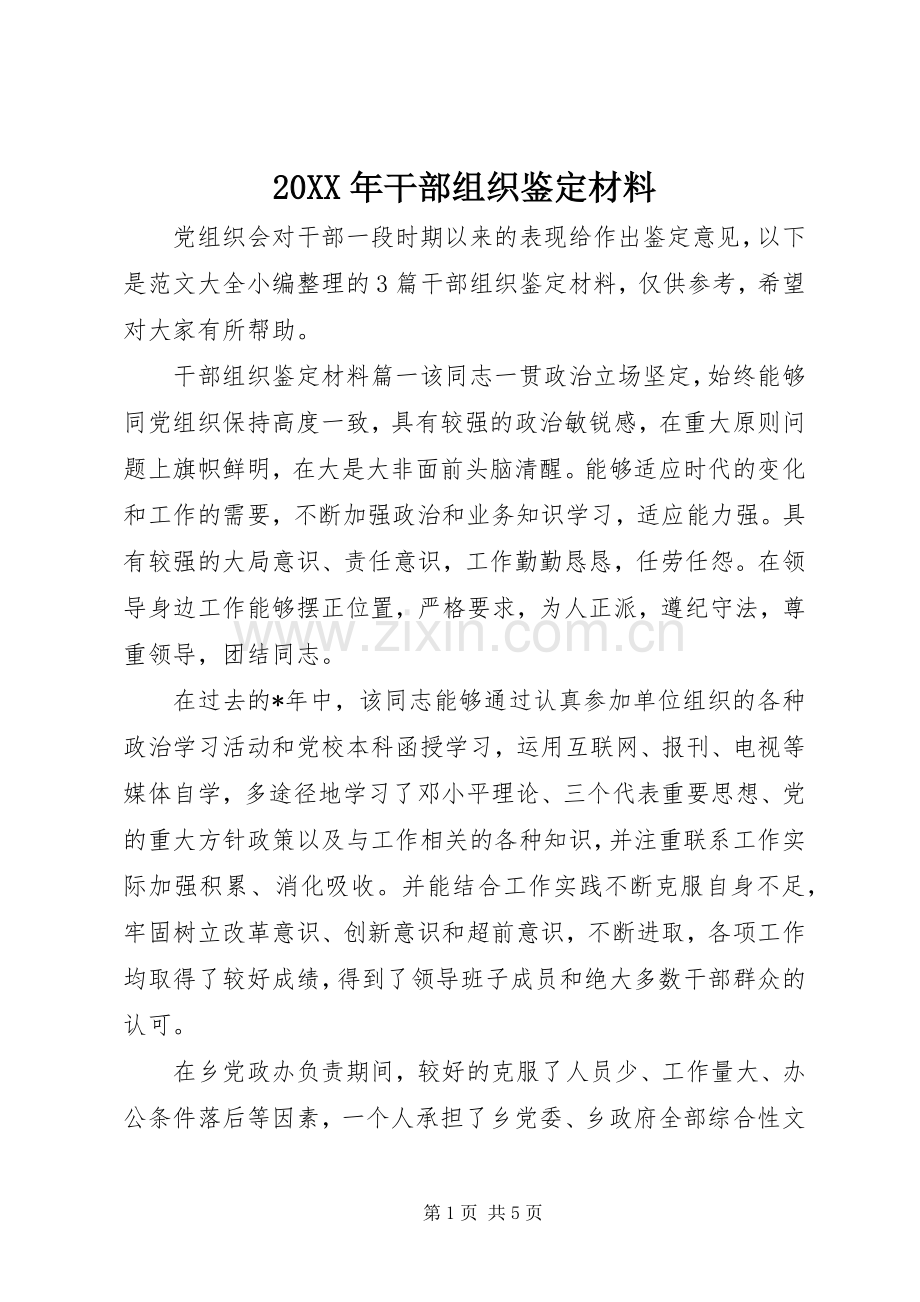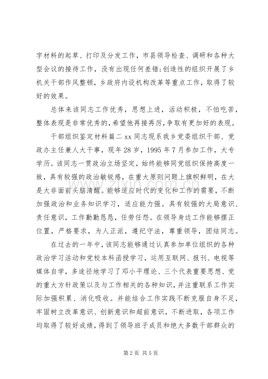 干部组织鉴定材料篇二xx同志现系我乡党委组织干部、党政办主任兼人大干事,现年28岁,1995年7月参加工作,大专学历。该同志一贯政治立场坚定,始终能够同党组织保持高度一致,具有较强的政治敏锐感,在重大原则问题上旗帜鲜明,在大是大非面前头脑清醒。能够适应时代的变化和工作的需要,不断加强政治和业务知识学习,适应能力强。具有较强的大局意识、责任意识,工作勤勤恳恳,任劳任怨。在领导身边工作能够摆正位置,严格要求,为人正派,遵纪守法,尊重领导,团结同志。