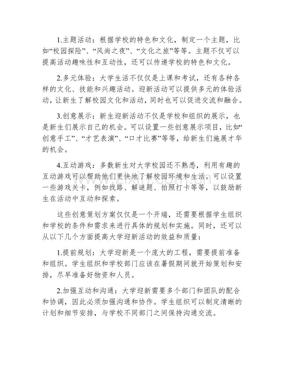 这些创意策划方案仅仅是一个开端,还需要根据学生组织和学校的条件和需求来进行具体的规划和实施。同时,还可以从以下几个方面提高大学迎新活动的效益和质量: