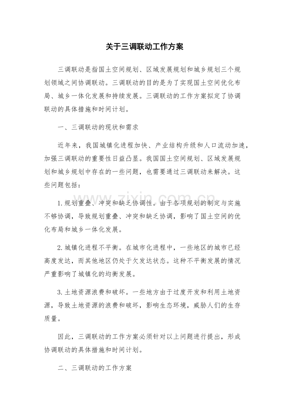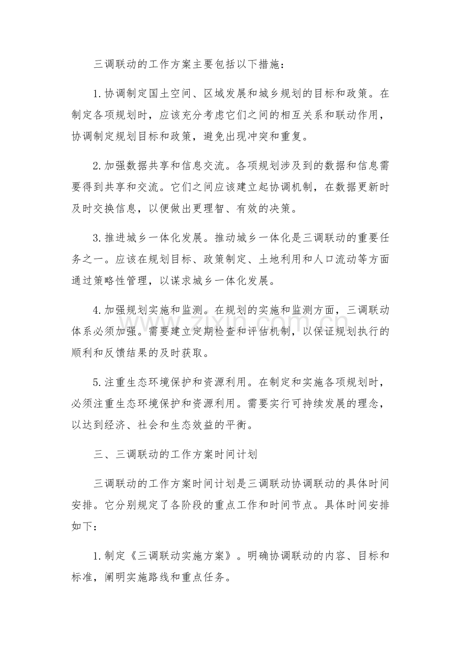 三调联动是指国土空间规划、区域发展规划和城乡规划三个规划领域之间协调联动。三调联动的目的是为了实现国土空间优化布局、城乡一体化发展和持续发展。三调联动的工作方案拟定了协调联动的具体措施和时间计划。