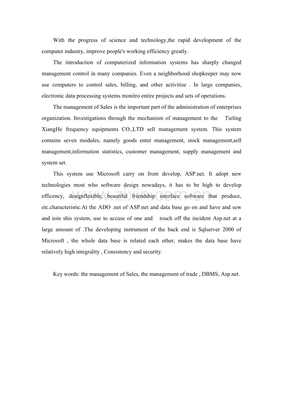 The management of Sales is the important part of the administration of enterprises organization. Investigations through the mechanism of management to the Tieling XiangHe frequency equipments CO.,LTD sell management system. This system contains seven modules, namely goods enter management, stock management,sell management,information statistics, customer management, supply management and system set.