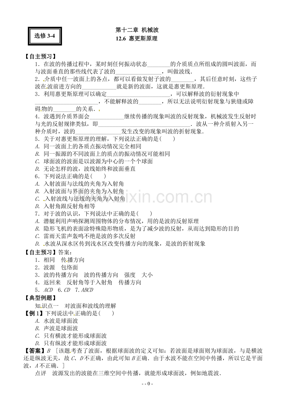 1.【解析】 惠更斯原理不能够解释所有的波的现象,有一定的局限性,A错.波面上的每一点(面源)都是一个次级球面波的子波源,子波的波速与频率等于初级波的波速和频率,B对.用惠更斯原理能够解释波的衍射现象,C错.同一波面上的两个位置的质点振动情况一定相同,D错.【答案】 B