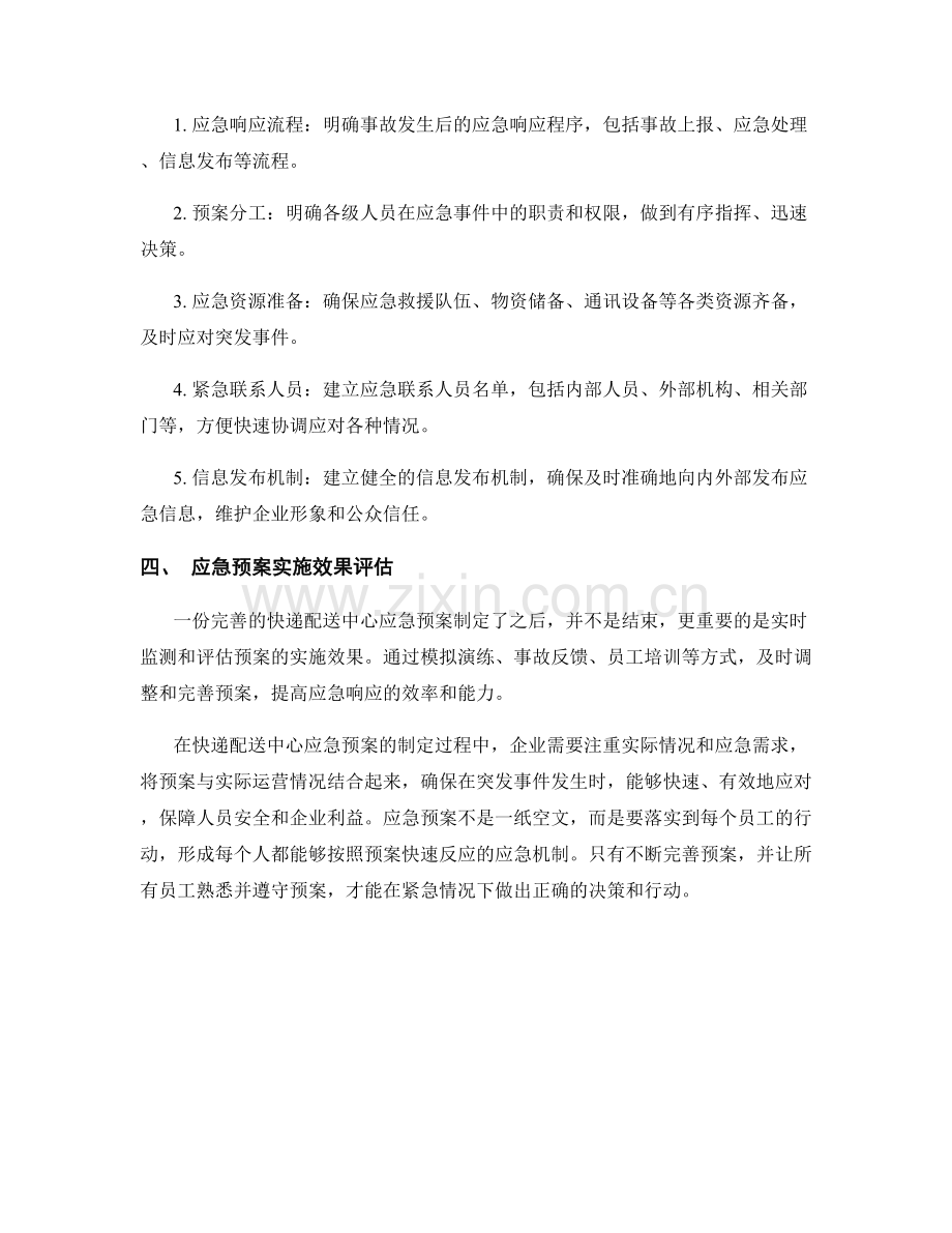 1. 了解现状:了解快递配送中心的具体情况,包括人员构成、业务范围、物流设备、配送路线等,为应急预案的制定打下基础。