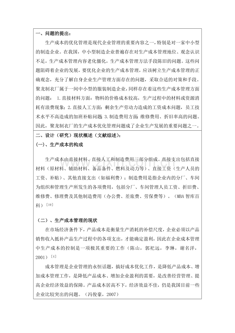 4.调查聚龙制衣厂生产成本管理的现状,并分析其存在问题。