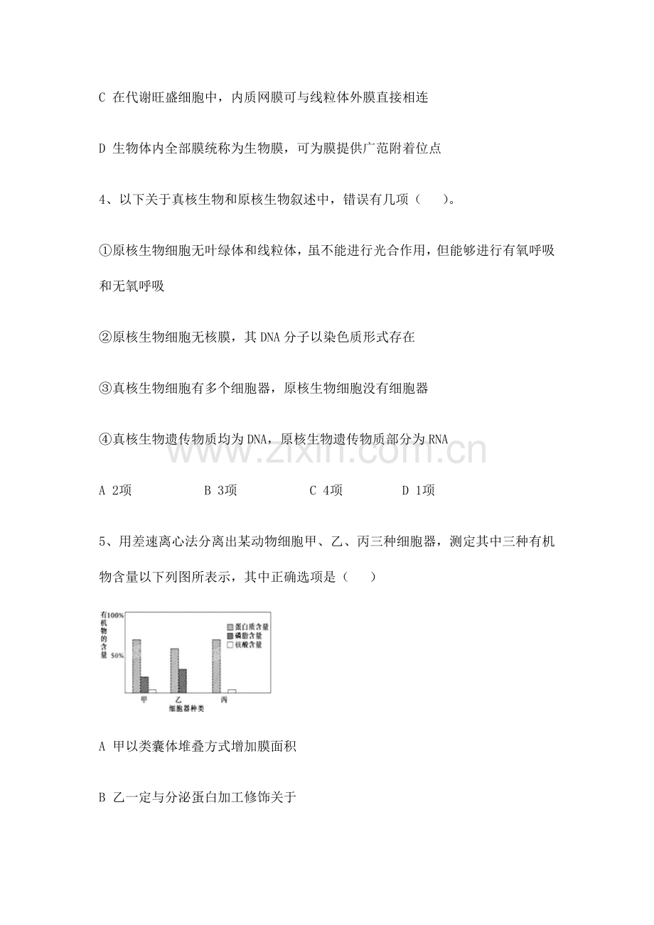 5、 用差速离心法分离出某动物细胞甲、乙、丙三种细胞器,测定其中三种有机物含量以下列图所表示,其中正确选项是( )