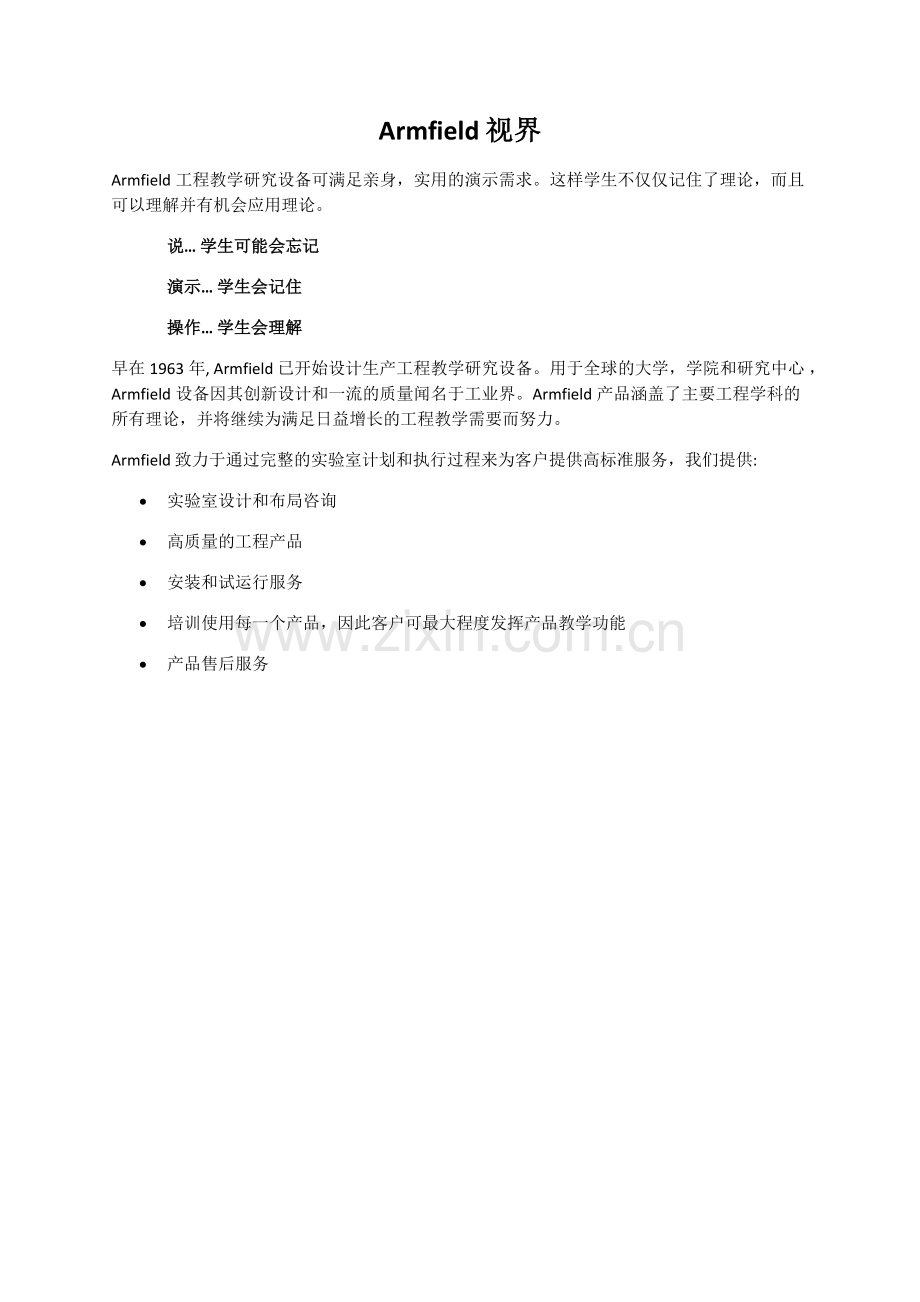 早在1963年, Armfield 已开始设计生产工程教学研究设备。用于全球的大学,学院和研究中心 ,Armfield设备因其创新设计和一流的质量闻名于工业界。Armfield产品涵盖了主要工程学科的所有理论,并将继续为满足日益增长的工程教学需要而努力。