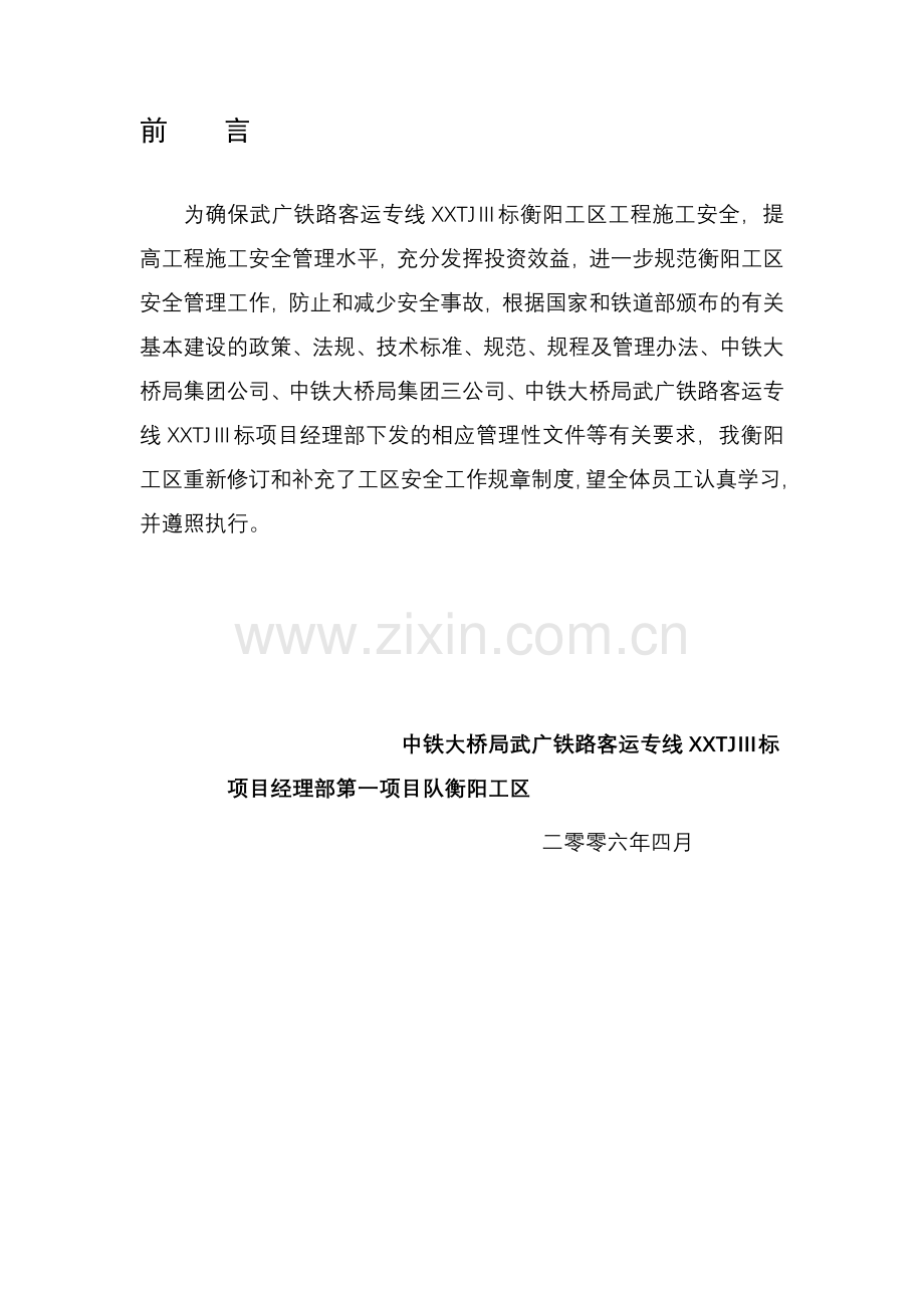 为确保武广铁路客运专线XXTJⅢ标衡阳工区工程施工安全,提高工程施工安全管理水平,充分发挥投资效益,进一步规范衡阳工区安全管理工作,防止和减少安全事故,根据国家和铁道部颁布的有关基本建设的政策、法规、技术标准、规范、规程及管理办法、中铁大桥局集团公司、中铁大桥局集团三公司、中铁大桥局武广铁路客运专线XXTJⅢ标项目经理部下发的相应管理性文件等有关要求,我衡阳工区重新修订和补充了工区安全工作规章制度,望全体员工认真学习,并遵照执行。