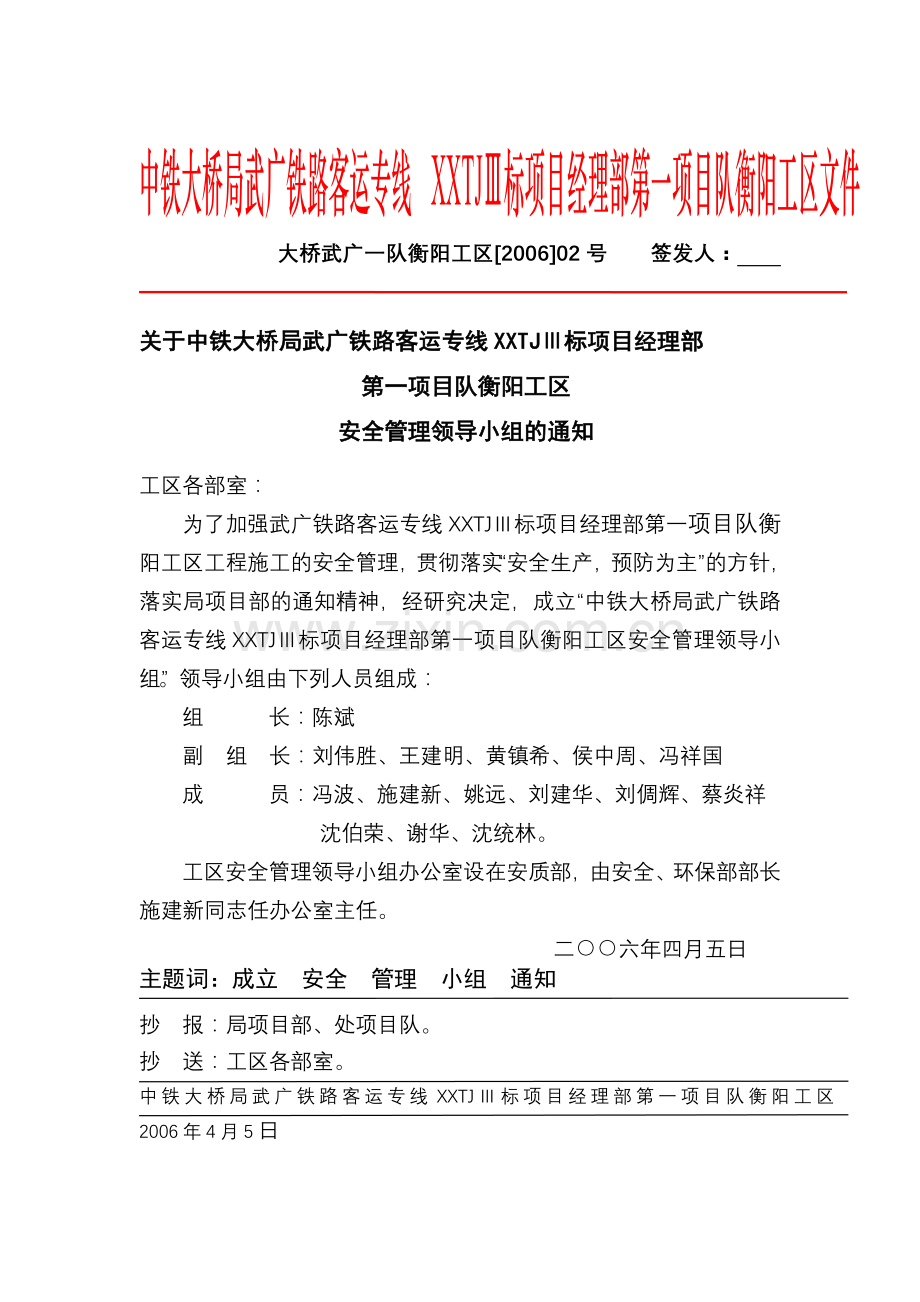 为了加强武广铁路客运专线XXTJⅢ标项目经理部第一项目队衡阳工区工程施工的安全管理,贯彻落实“安全生产,预防为主”的方针,落实局项目部的通知精神,经研究决定,成立“中铁大桥局武广铁路客运专线XXTJⅢ标项目经理部第一项目队衡阳工区安全管理领导小组”。领导小组由下列人员组成: