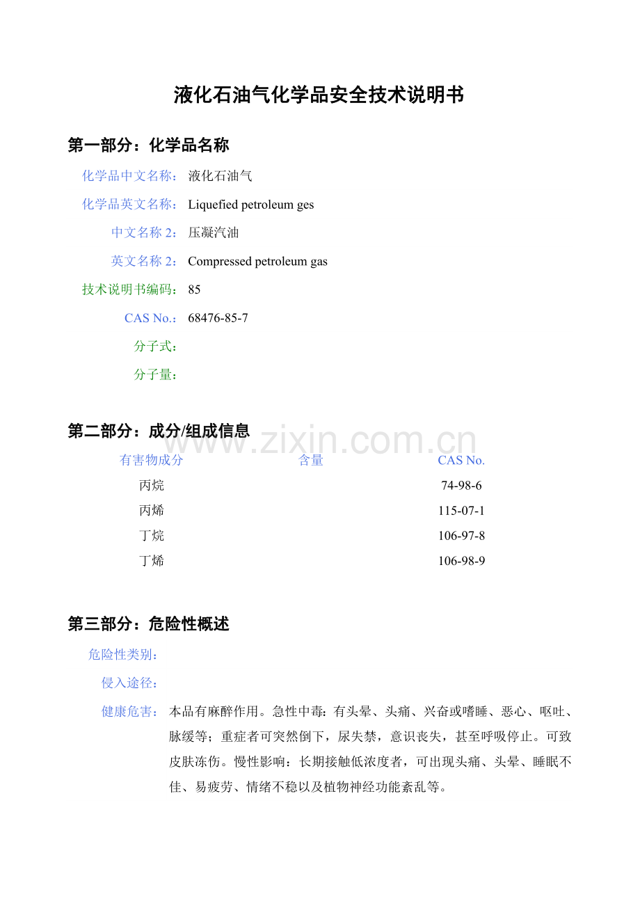 化学危险物品安全管理条例 (1987年2月17日国务院发布),化学危险物品安全管理条例实施细则 (化劳发[1992] 677号),工作场所安全使用化学品规定 ([1996]劳部发423号)等法规,针对化学危险品的安全使用、生产、储存、运输、装卸等方面均作了相应规定;常用危险化学品的分类及标志 (GB 13690-92)将该物质划为第2.1 类易燃气体;车间空气中液化石油气卫生标准 (GB 11518-89),规定了车间空气中该物质的最高容许浓度及检测方法。其它法规:液化石油气汽车槽车安全管理规定 ([81]劳总锅字1号)。