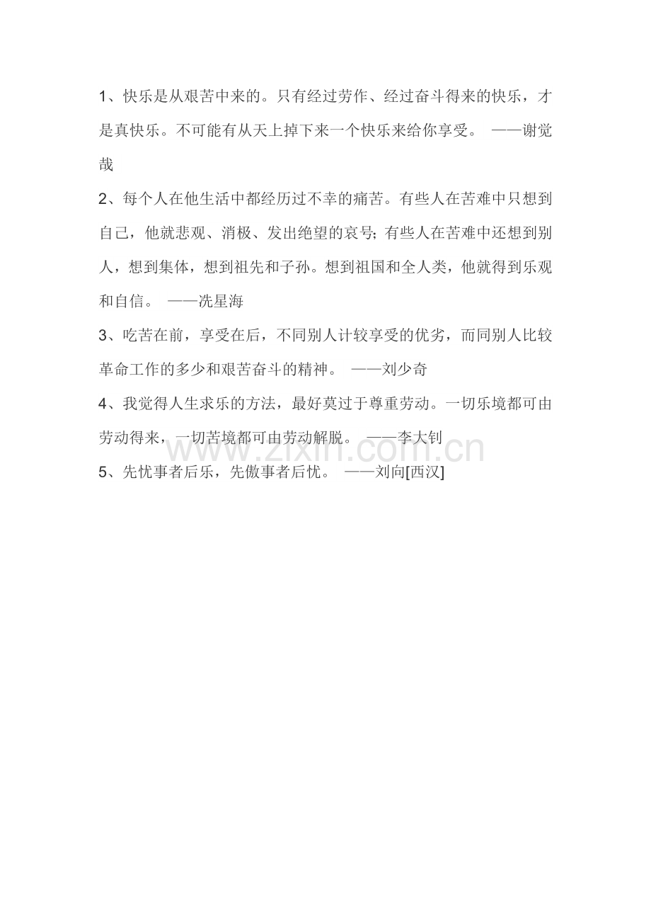 1、快乐是从艰苦中来的。只有经过劳作、经过奋斗得来的快乐,才是真快乐。不可能有从天上掉下来一个快乐来给你享受。 ——谢觉哉