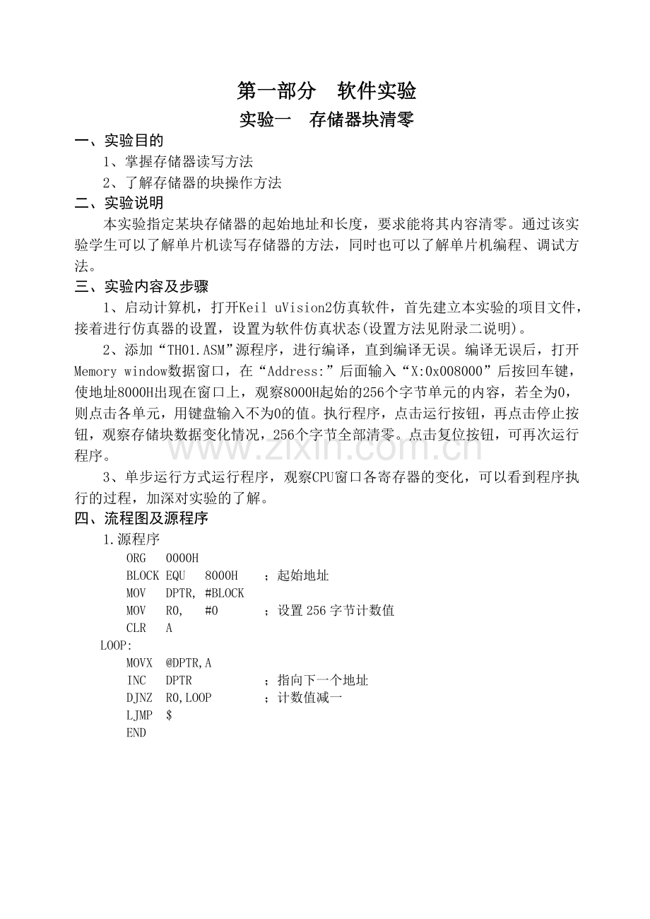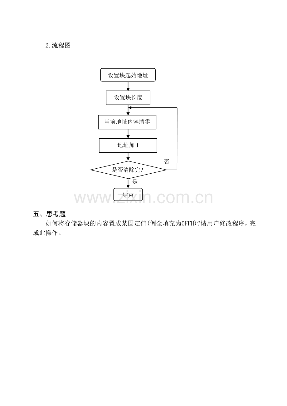 本实验指定某块存储器的起始地址和长度,要求能将其内容清零。通过该实验学生可以了解单片机读写存储器的方法,同时也可以了解单片机编程、调试方法。