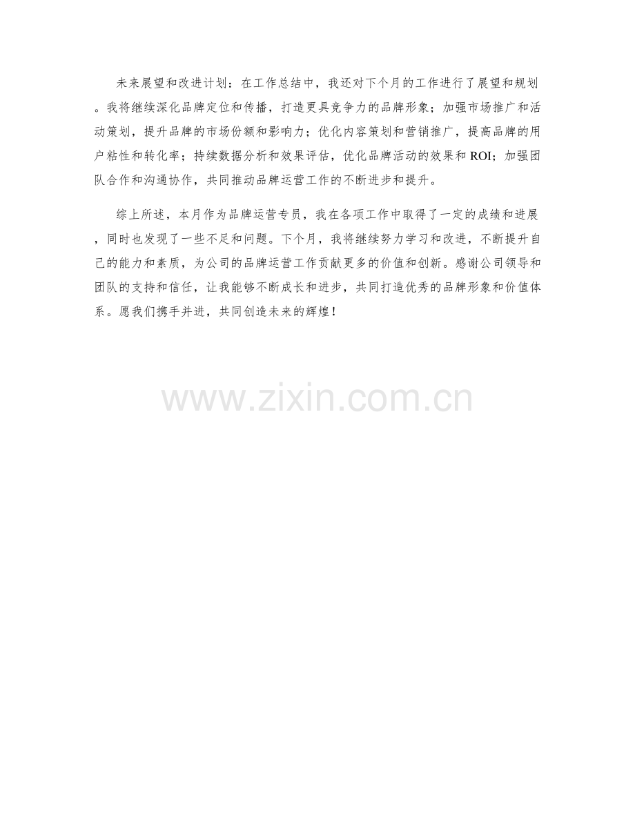综上所述,本月作为品牌运营专员,我在各项工作中取得了一定的成绩和进展,同时也发现了一些不足和问题。下个月,我将继续努力学习和改进,不断提升自己的能力和素质,为公司的品牌运营工作贡献更多的价值和创新。感谢公司领导和团队的支持和信任,让我能够不断成长和进步,共同打造优秀的品牌形象和价值体系。愿我们携手并进,共同创造未来的辉煌!