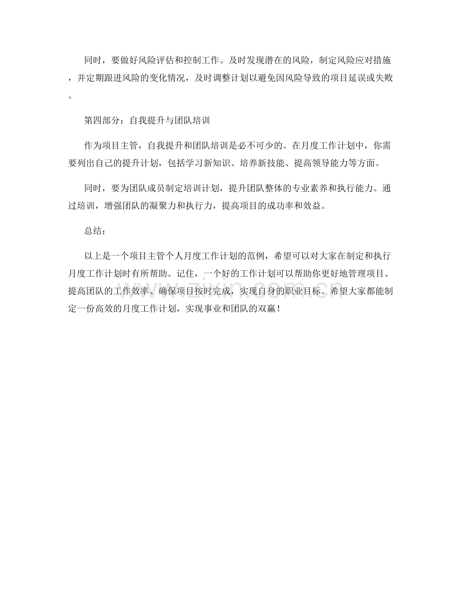 以上是一个项目主管个人月度工作计划的范例,希望可以对大家在制定和执行月度工作计划时有所帮助。记住,一个好的工作计划可以帮助你更好地管理项目、提高团队的工作效率、确保项目按时完成,实现自身的职业目标。希望大家都能制定一份高效的月度工作计划,实现事业和团队的双赢!
