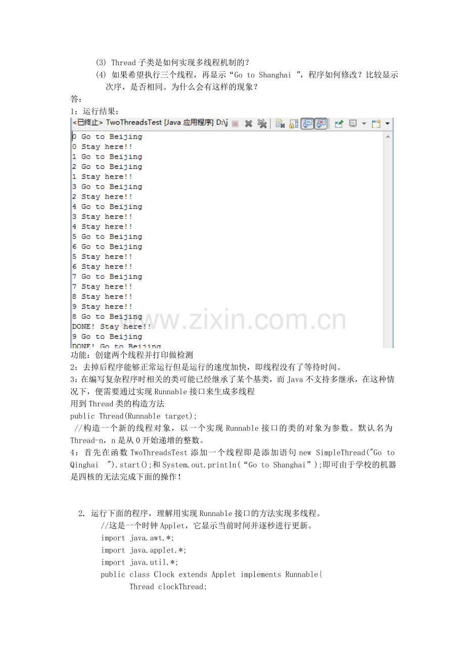 4:首先在函数TwoThreadsTest添加一个线程即是添加语句new SimpleThread("Go to Qinghai ").start();和System.out.println(“Go to Shanghai”);即可由于学校的机器是四核的无法完成下面的操作!