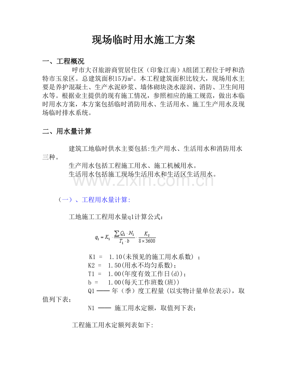 呼市大召旅游商贸居住区(印象江南)A组团工程位于呼和浩特市玉泉区。总建筑面积15万m2。本工程建筑面积比较大,现场用水主要是养护混凝土、生产水泥砂浆、墙体砌块浇水湿润、消防、卫生间用水等。根据业主提供的现有施工情况,参照相应的施工规范,做出本临时用水方案,本方案包括临时消防用水、生活用水、施工生产用水及现场临时排水系统。