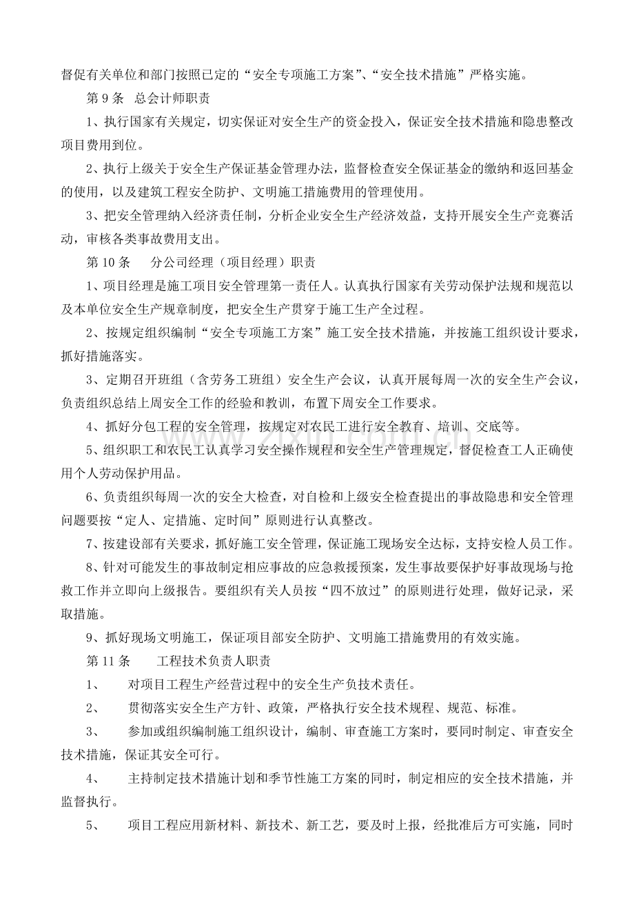 第3条 各级人员安全生产责任制是贯彻执行党和国家劳动保护法规及各项安全生产规章制度的重要组织措施。在实际生产经营目标管理中,必须切实抓好安全生产责任制的落实,保证安全目标的实现,促进施工生产健康发展。