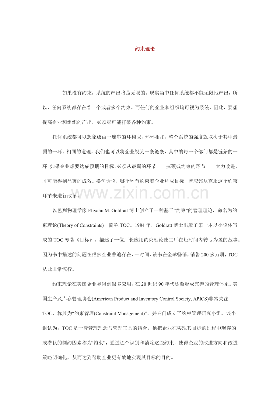以色列物理学家Eliyahu M. Goldratt博士创立了一种基于“约束”的管理理论,命名为约束理论(Theory of Constraints),简称TOC。1984年,Goldratt博士出版了第一本以小说体写成的TOC专著《目标》,描述了一位厂长应用约束理论使工厂在短时间内转亏为盈的故事。因为书中描述的问题在很多企业普遍存在,一时间,该书在全球畅销,销售200多万册,TOC从此非常流行。