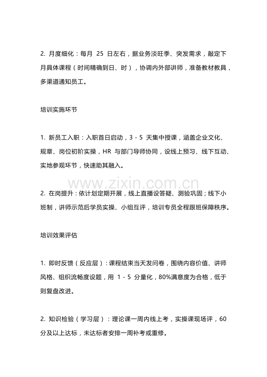 2. 月度细化:每月 25 日左右,据业务淡旺季、突发需求,敲定下月具体课程(时间精确到日、时),协调内外部讲师,准备教材教具,多渠道通知员工。