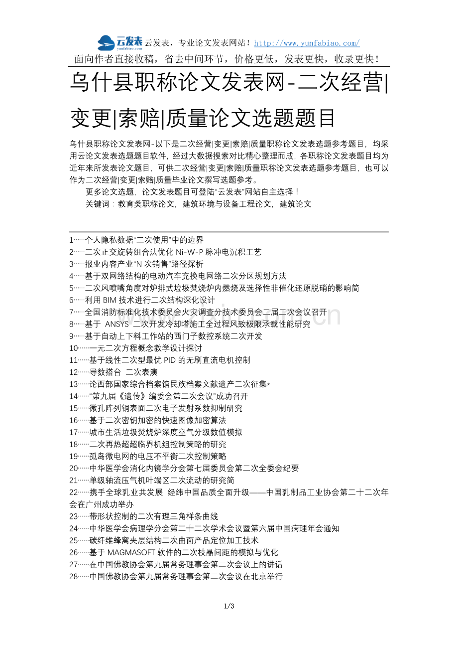 乌什县职称论文发表网-以下是二次经营|变更|索赔|质量职称论文发表选题参考题目,均采用云论文发表选题题目软件,经过大数据搜索对比精心整理而成,各职称论文发表题目均为近年来所发表论文题目,可供二次经营|变更|索赔|质量职称论文发表选题参考题目,也可以作为二次经营|变更|索赔|质量毕业论文撰写选题参考。