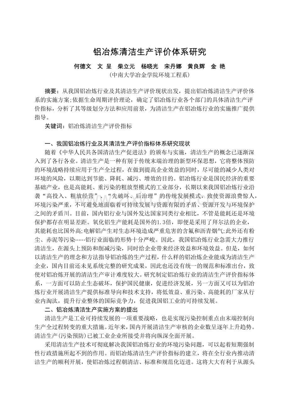 一、我国铝冶炼行业及其清洁生产评价指标体系研究现状