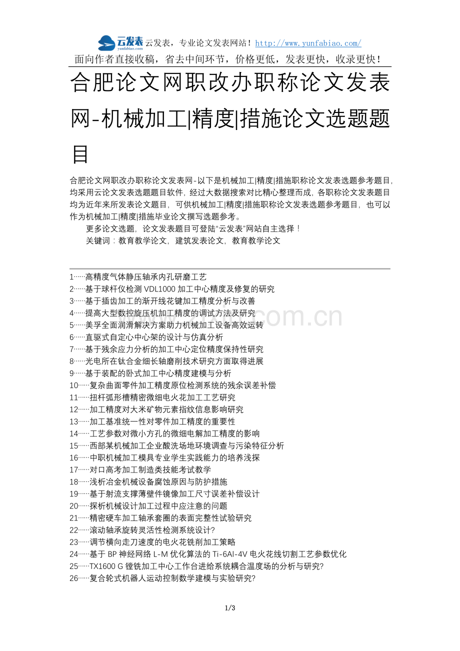 合肥论文网职改办职称论文发表网-以下是机械加工|精度|措施职称论文发表选题参考题目,均采用云论文发表选题题目软件,经过大数据搜索对比精心整理而成,各职称论文发表题目均为近年来所发表论文题目,可供机械加工|精度|措施职称论文发表选题参考题目,也可以作为机械加工|精度|措施毕业论文撰写选题参考。