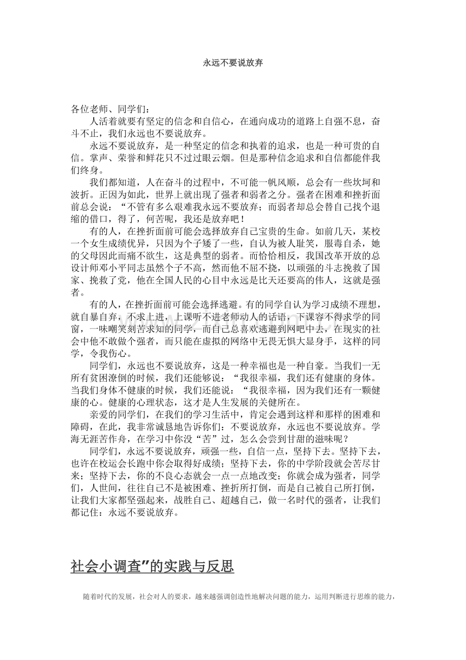 同学们,永远不要说放弃,顽强一些,自信一点,坚持下去。坚持下去,也许在校运会长跑中你会取得好成绩;坚持下去,你的中学阶段就会苦尽甘来;坚持下去,你的不良心态就会一点一点地改变;你就会成为强者,同学们,人世间,往往自己不是被困难、挫折所打倒,而是自己被自己所打倒,让我们大家都坚强起来,战胜自己、超越自己,做一名时代的强者,让我们都记住:永远不要说放弃。