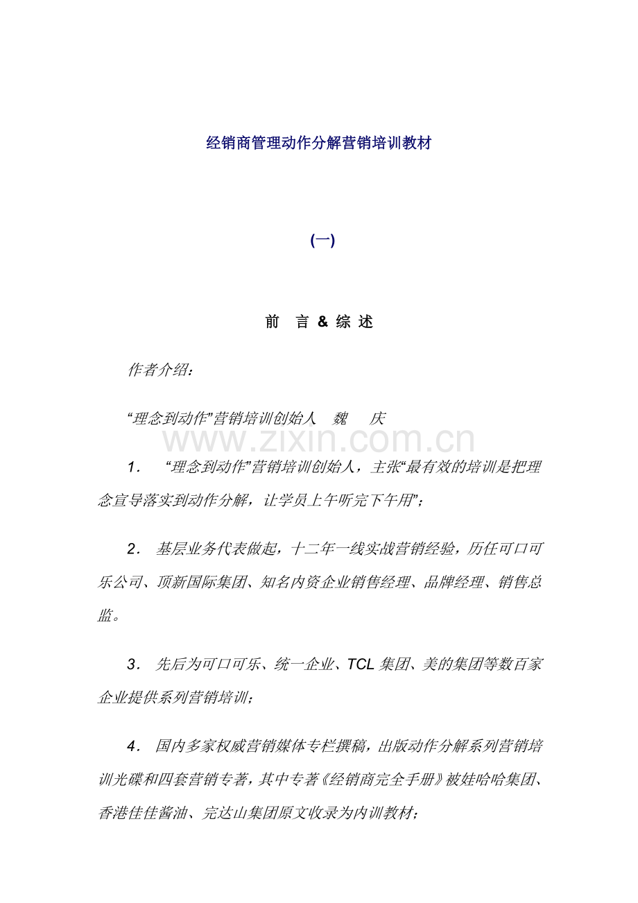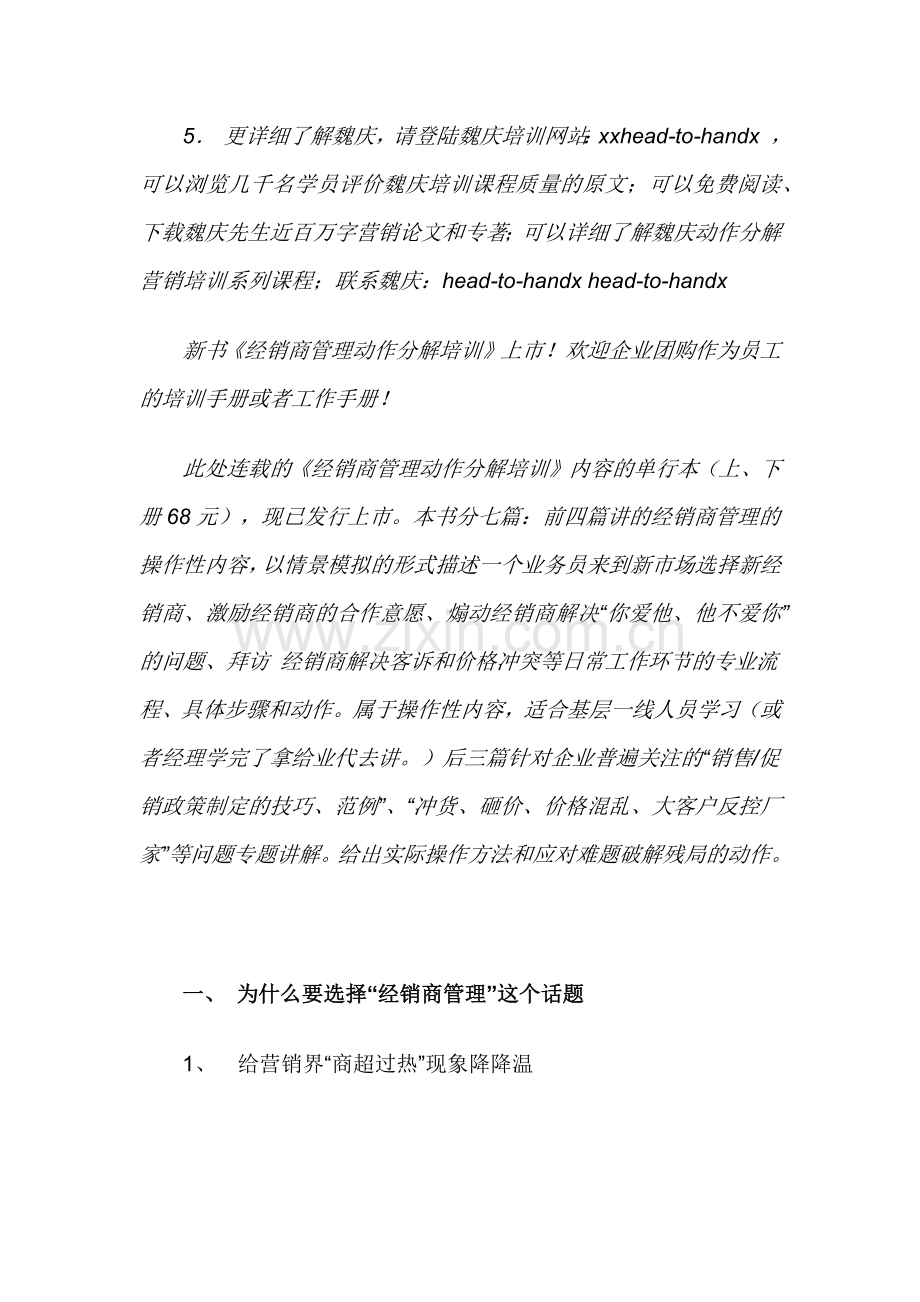 此处连载的《经销商管理动作分解培训》内容的单行本(上、下册68元),现已发行上市。本书分七篇:前四篇讲的经销商管理的操作性内容,以情景模拟的形式描述一个业务员来到新市场选择新经销商、激励经销商的合作意愿、煽动经销商解决“你爱他、他不爱你”的问题、拜访 经销商解决客诉和价格冲突等日常工作环节的专业流程、具体步骤和动作。属于操作性内容,适合基层一线人员学习(或者经理学完了拿给业代去讲。)后三篇针对企业普遍关注的“销售/促销政策制定的技巧、范例”、“冲货、砸价、价格混乱、大客户反控厂家”等问题专题讲解。给出实际操作方法和应对难题破解残局的动作。