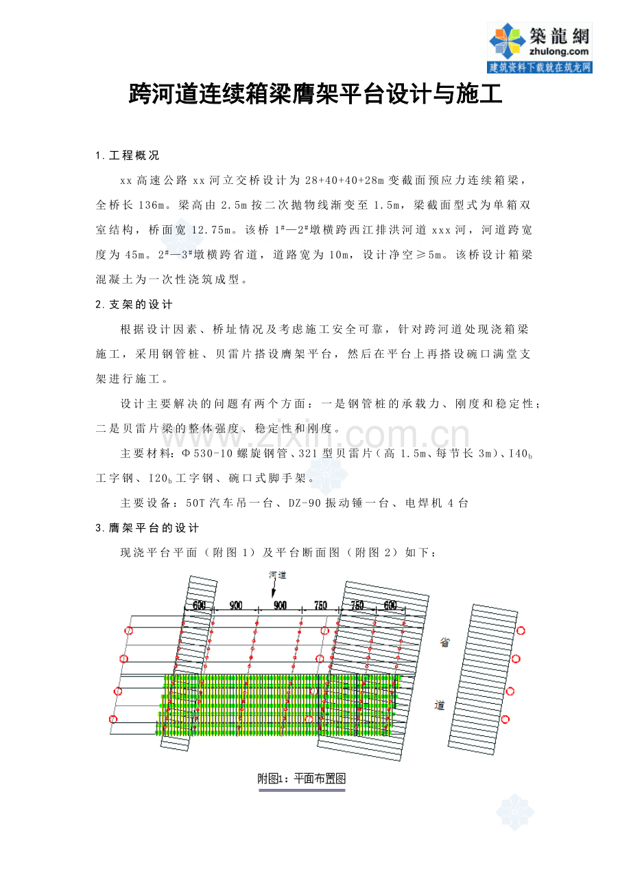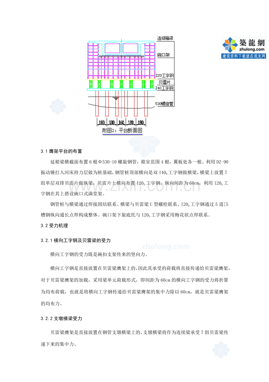 主要材料:Φ530-10螺旋钢管、321型贝雷片(高1.5m、每节长3m)、I40b工字钢、I20b工字钢、碗口式脚手架。