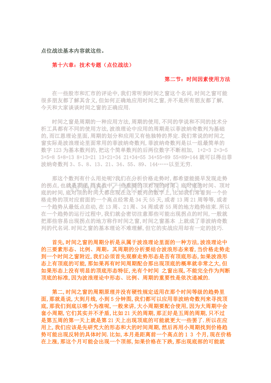 时间之窗是周期的一种应用方法,周期的使用,不同的学说和不同的技术分析工具都有不同的使用方法,波浪理论中应用的周期是以菲波纳奇数列为基础的,而江恩理论里面,周期的划分和应用又有他独特的界定.我们常说的时间之窗实际是波浪理论里面常用的菲波纳奇数列,菲波纳奇数列是以一组最简单的数字123为基本数列的,把这个简单数列的后两位数字不断相加, 1+2=3 2+3=5 3+5=8 5+8=13 8+13=21 13+21=34 21+34=55 34+55=89 55+89=144就可以得出菲波纳奇数列3、5、8、13、21、34、55、89、144……以至无穷.