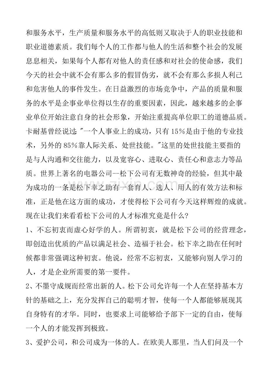 在现代社会中,职业道德在人们事业中所起的作用表现得越来越突出。因为随着社会的进步,人们生活水平的提高往往是从人们享受的产品和服务的质量中得到具体体现的,而产品和服务质量取决于生产质量和服务水平,生产质量和服务水平的高低则又取决于人的职业技能和职业道德素质。我们每个人的工作都与他人的生活和整个社会的发展息息相关,如果每个人都有对他人的责任感和对社会的使命感,我们今天的社会中就不会有那么多的假冒伪劣,就不会有那么多损人利己和危害他人的事件发生。在日益激烈的市场竞争中,产品的质量和服务的水平是企事业单位得以生存的重要因素,因此,越来越多的企事业单位开始注意自身的社会形象,开始注重提高单位职工的道德品质。卡耐基曾经说过:"一个人事业上的成功,只有15%是由于他的专业技术,另外的85%靠人际关系、处世技能。"这里的处世技能主要指的是与人沟通和交往能力,以及宽容心、进取心、责任心和意志力等品质。世界上著名的电器公司--松下公司有无数神奇的经验,但其中最为成功的一条是松下幸之助有一套育人、选人、用人的有效方法和标准,正是他在这方面的成功,才使得松下公司有今天这样辉煌的成就。