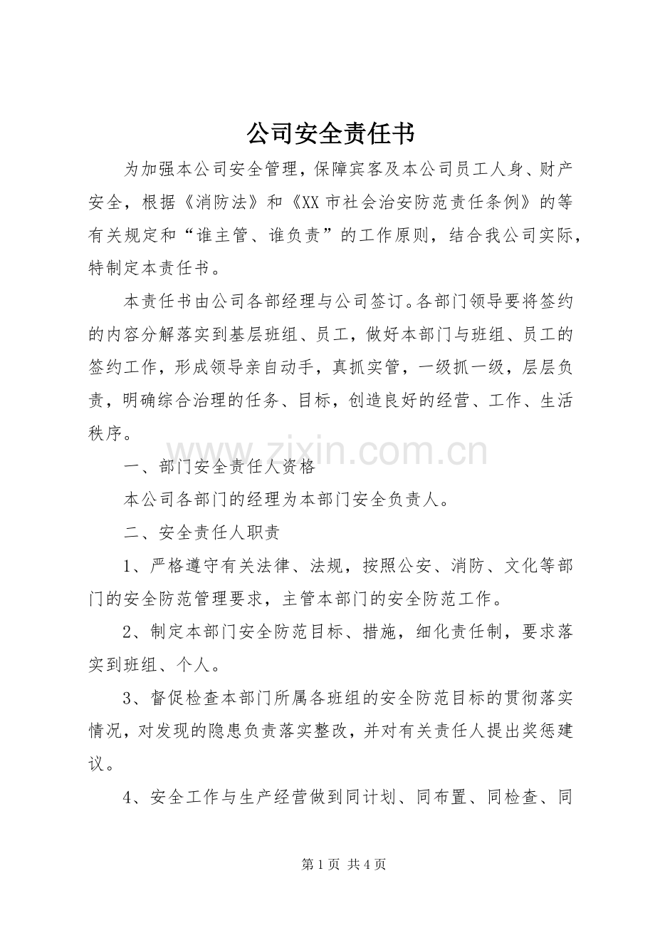 为加强本公司安全管理,保障宾客及本公司员工人身、财产安全,根据《消防法》和《XX市社会治安防范责任条例》的等有关规定和“谁主管、谁负责”的工作原则,结合我公司实际,特制定本责任书。