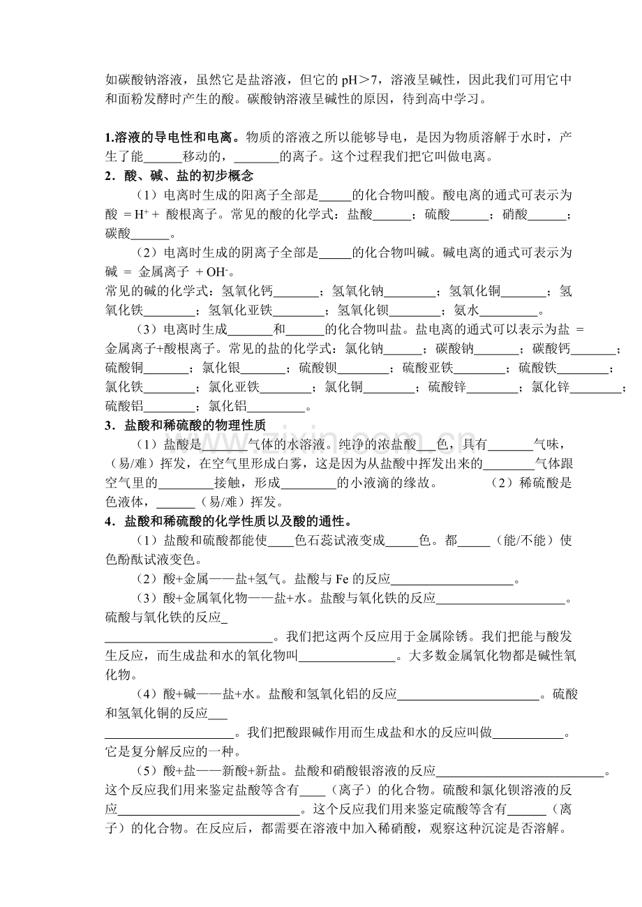 本章是全书的重点。常见酸、碱、盐的化学性质及有关反应的化学方程式,从电离的角度分析酸、碱、盐的性质,从而总结出酸的通性,碱的通性及盐的性质,这是本章的重点。