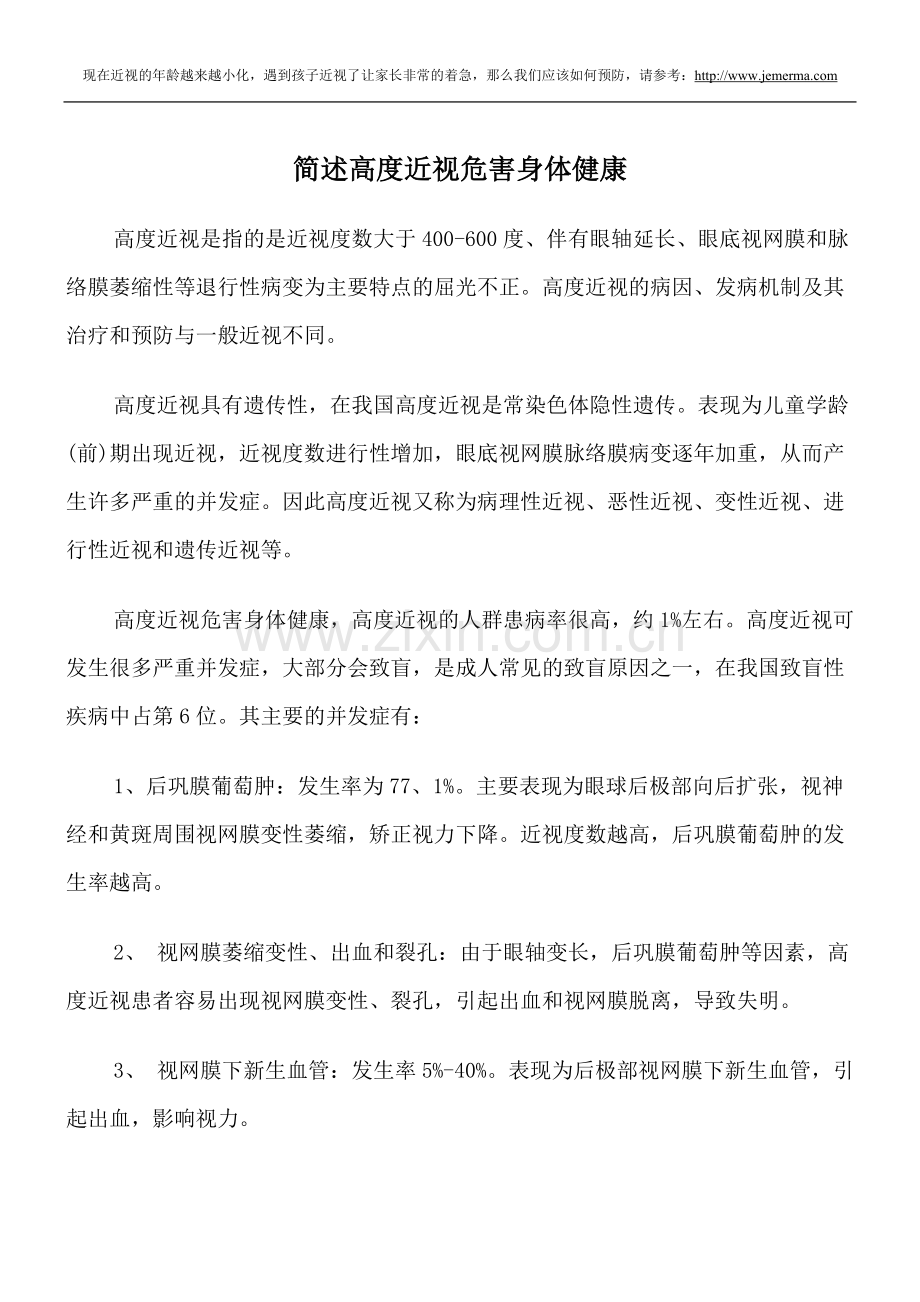 高度近视危害身体健康,高度近视的人群患病率很高,约1%左右。高度近视可发生很多严重并发症,大部分会致盲,是成人常见的致盲原因之一,在我国致盲性疾病中占第6位。其主要的并发症有: