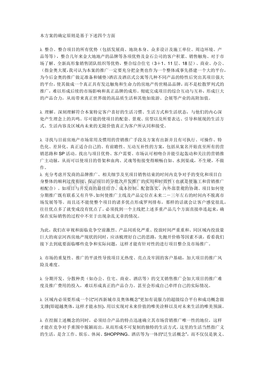 l 整合。整合项目的所有优势(包括发展商、地块本身、众多设计及施工单位、周边环境、产品等等),整合几年来金大地地产的品牌等各项优势及金石公司的客户积累、销售触角、对于市场了解、全新高形象销售团队组织等优势,整合综合住宅(3+1、11层、18层)、商业、办公、(指金奥大厦,我司认为本案的推广一定要充分把金奥也作为一个整体或事先搭建一个大的平台,为今后金奥的推广做足准备和铺垫)酒店及酒店式公寓等几种不同产品的特性后突出其项目强大的平台,使其做成一个真正具有发达触角和生命力的房地产传世精品品牌,而不是松散罗列式的推广,难以形成后续的市场影响和真正品牌的成形。彻底完成项目的综合互动与互补,形成巨大的产品合力,从而带来真正世界级的高品质生活和其他如旅游、会展等产业的高附加值。