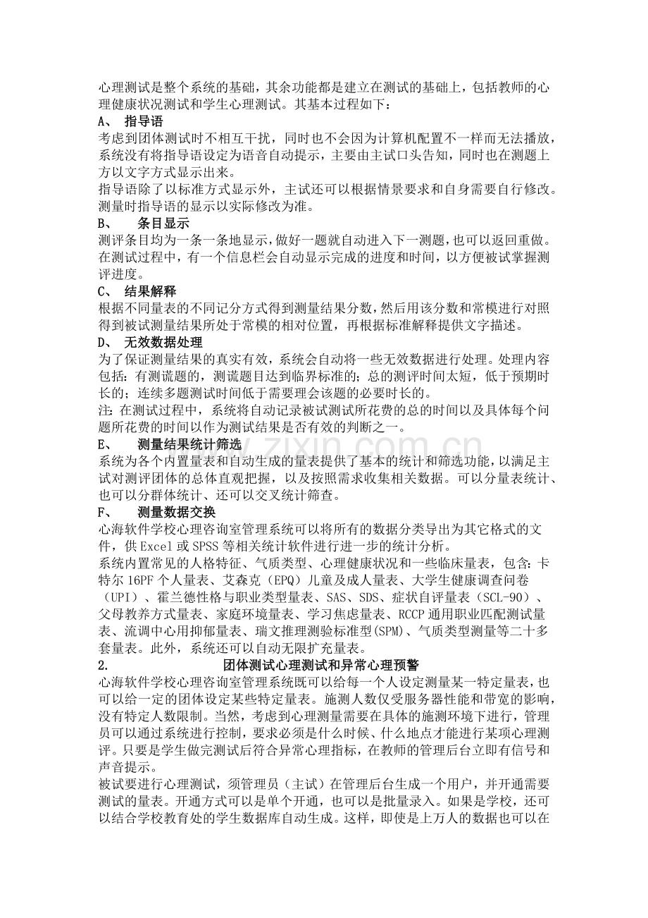该系统包括档案系统、测量系统、交流系统、决策管理等几大模块。各个模块的协调工作,可以系统地反映出现阶段学生的心理健康状况和心理素质水平,为学校心理健康教育与正常的教育教学工作提供直接现实的依据。