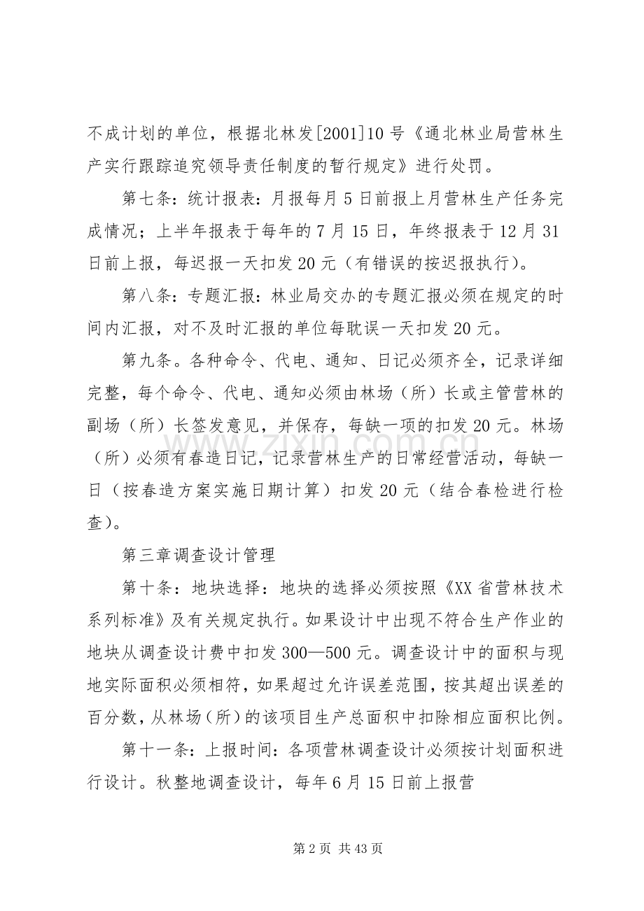 为加强营林生产管理,提高营林生产管理水平,保证各项生产指标按时、按质、按量完成。依据国家林业局下发的《造林质量管理暂行办法》、《造林质量事故行政责任追究制度的规定》、《XX省营林技术系列标准》及有关规定,特制定本办法。