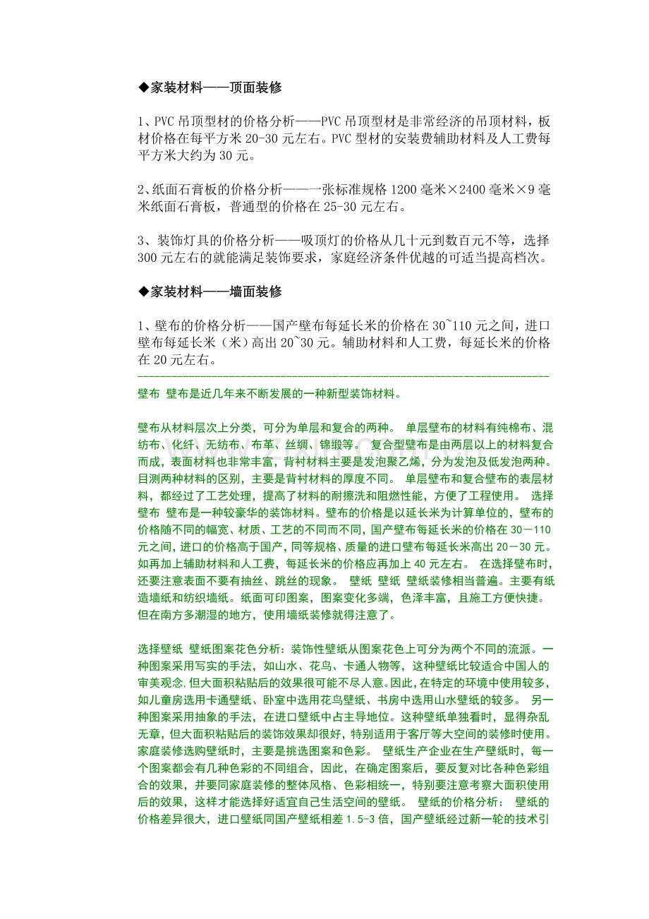 2、壁纸的价格分析——壁纸的价格差异很大,进口壁纸同国产壁纸相差1.5-3倍,国产壁纸每卷实际数量为5.3平方米,国产壁纸每卷价格在30-70元之间。在实际粘贴中,壁纸存在10%-17%的合理损耗。壁纸的施工,辅料及人工费每平方米在20元左右。