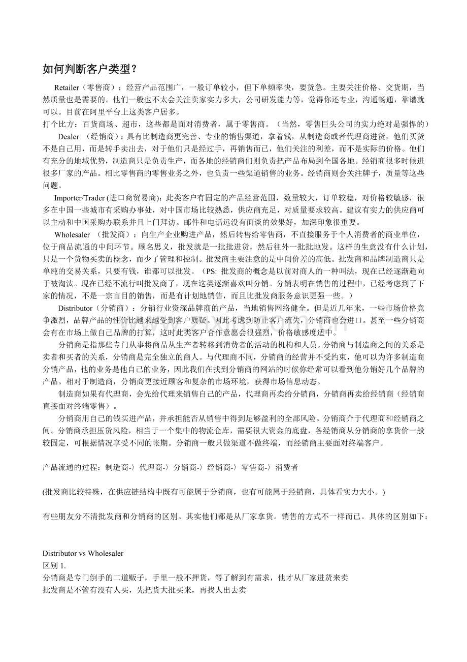 Importer/Trader (进口商贸易商):此类客户有固定的产品经营范围,数量较大,订单较稳,对价格较敏感,很多在中国一些城市有采购办事处,对中国市场比较熟悉,供应商充足,对质量要求较高。建议有实力的供应商可以主动和中国采购办联系并且上门拜访。邮件和电话远没有面谈的效果好,加深印象很重要。