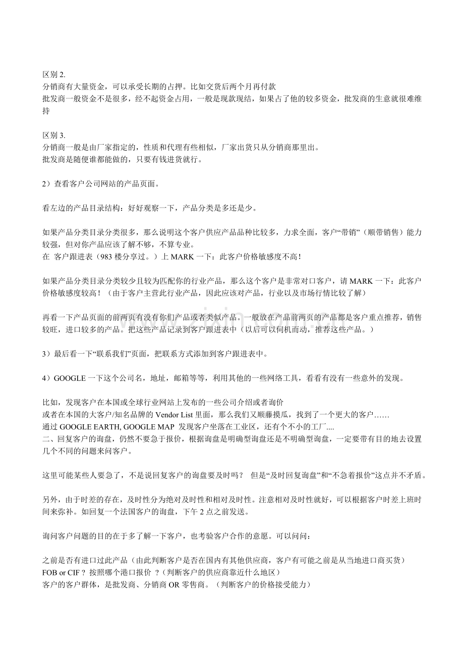 根据对客户的判断:客户是中间商?是什么性质?进口商批发商,还是分销商、零售商?客户专业做这个吗?产品杂还是精?客户的供应商多吗?客户会对价格敏感吗?客户有大规模的网站和分支机构,或者在网上大肆散布求购信息吗?客户的实力怎样?