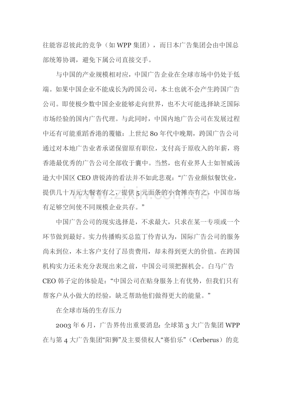 年收入58亿美元的WPP集团迫于市场压力,积极开展对外并购。继2000-2001年接连吞并扬雅(Young&Rubicam,世界排名14位,2002年收入4.42亿美元)和Tempus广告集团后,2003年又以极低的代价买下Cordiant。WPP旗下拥有60多家传播服务公司,业务囊括了市场研究、公共关系、互动行销、视觉管理和咨询等领域。
