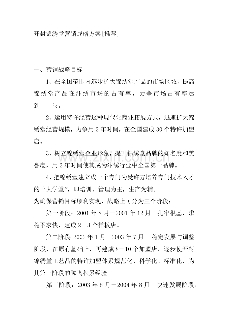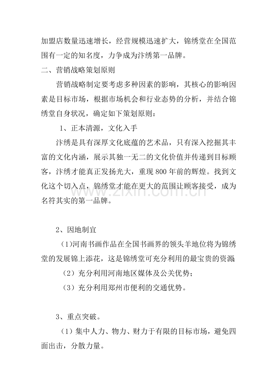 1、在全国范围内逐步扩大锦绣堂产品的市场区域,提高锦绣堂产品在汴绣市场的占有率,力争市场占有率达到 %。