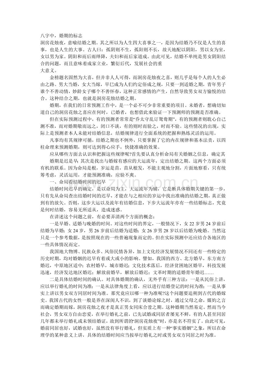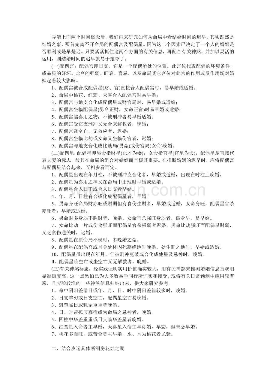 1、配偶星出现在年月柱,不被刑冲克合化者,早婚或适婚,出现在时柱上晚婚。
