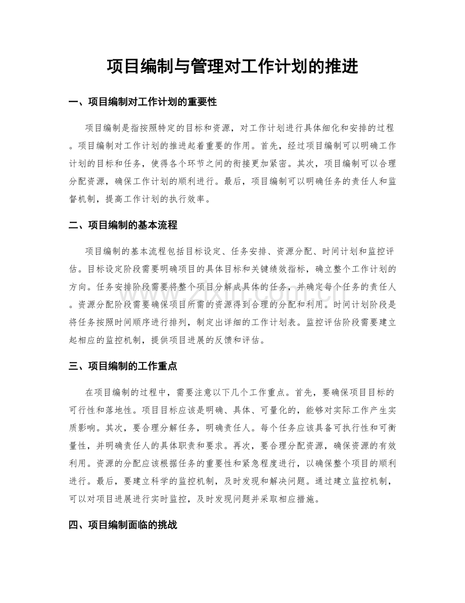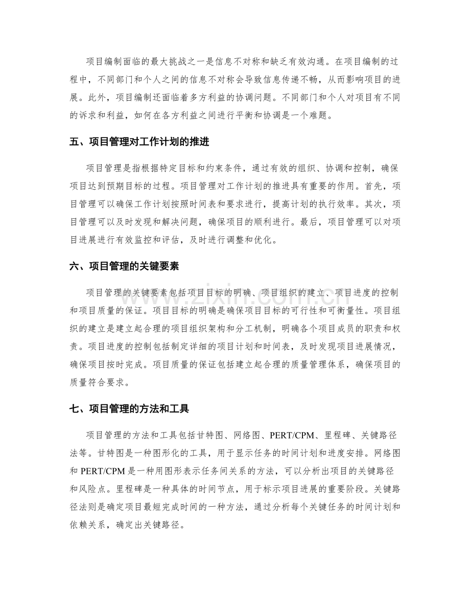 项目编制是指按照特定的目标和资源,对工作计划进行具体细化和安排的过程。项目编制对工作计划的推进起着重要的作用。首先,经过项目编制可以明确工作计划的目标和任务,使得各个环节之间的衔接更加紧密。其次,项目编制可以合理分配资源,确保工作计划的顺利进行。最后,项目编制可以明确任务的责任人和监督机制,提高工作计划的执行效率。