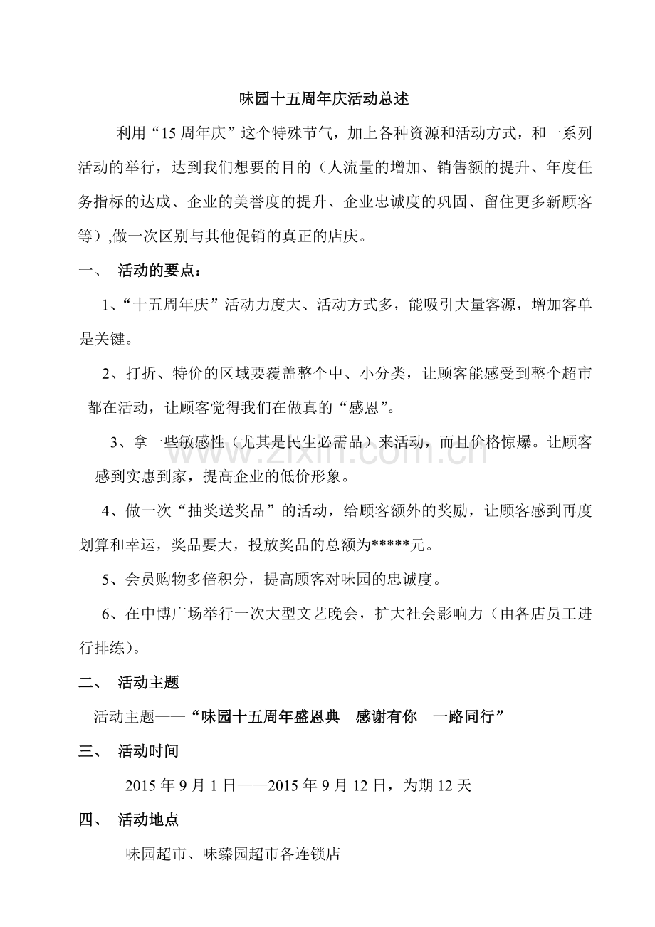 利用“15周年庆”这个特殊节气,加上各种资源和活动方式,和一系列活动的举行,达到我们想要的目的(人流量的增加、销售额的提升、年度任务指标的达成、企业的美誉度的提升、企业忠诚度的巩固、留住更多新顾客等),做一次区别与其他促销的真正的店庆。