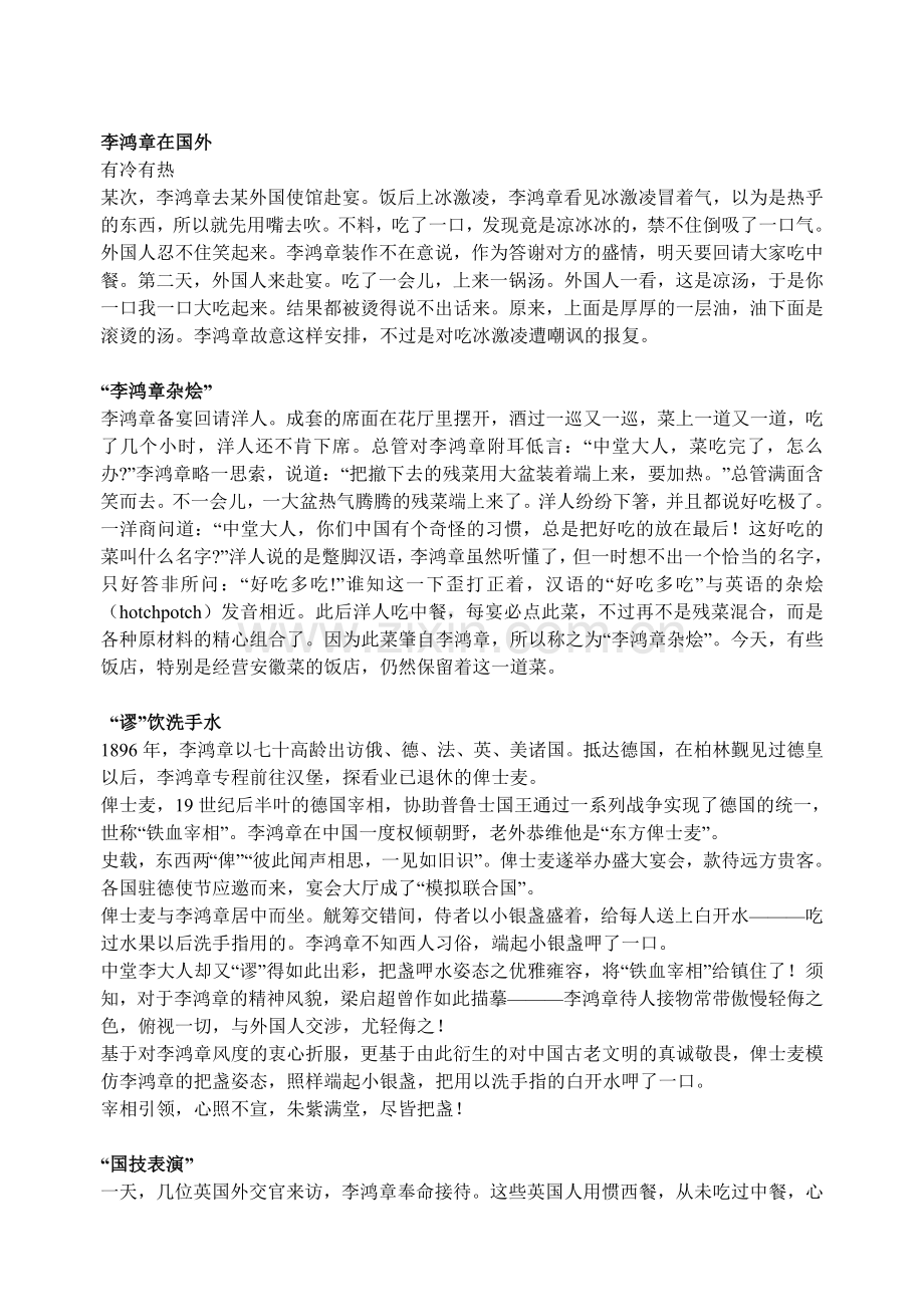 李鸿章备宴回请洋人。成套的席面在花厅里摆开,酒过一巡又一巡,菜上一道又一道,吃了几个小时,洋人还不肯下席。总管对李鸿章附耳低言:“中堂大人,菜吃完了,怎么办?”李鸿章略一思索,说道:“把撤下去的残菜用大盆装着端上来,要加热。”总管满面含笑而去。不一会儿,一大盆热气腾腾的残菜端上来了。洋人纷纷下箸,并且都说好吃极了。一洋商问道:“中堂大人,你们中国有个奇怪的习惯,总是把好吃的放在最后!这好吃的菜叫什么名字?”洋人说的是蹩脚汉语,李鸿章虽然听懂了,但一时想不出一个恰当的名字,只好答非所问:“好吃多吃!”谁知这一下歪打正着,汉语的“好吃多吃”与英语的杂烩(hotchpotch)发音相近。此后洋人吃中餐,每宴必点此菜,不过再不是残菜混合,而是各种原材料的精心组合了。因为此菜肇自李鸿章,所以称之为“李鸿章杂烩”。今天,有些饭店,特别是经营安徽菜的饭店,仍然保留着这一道菜。