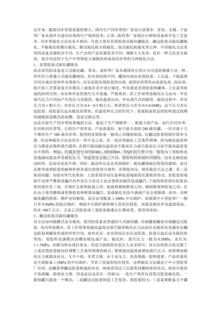 近年来,随着同步带需求量的增大,国内生产同步带的厂家也日益增多。青岛、无锡、宁波等厂家从国外引进同步带的生产线和技术,江苏、陕西等厂家则自行研制设备和开发工艺技术。同步带硫化方法也各不相同,目前主要有直筒胶套式硫化罐硫化、翻边胶套式硫化罐硫化、平板硫化机模压硫化、额式硫化机分段硫化、鼓式硫化机硫化等五种。不同硫化方法采用的设备及辅机亦不同,生产出的产品质量优劣不同,规格大小各异,没有一种方法是全能的。现介绍适用于生产中等和较大规格的单面齿同步带的几种硫化方法。