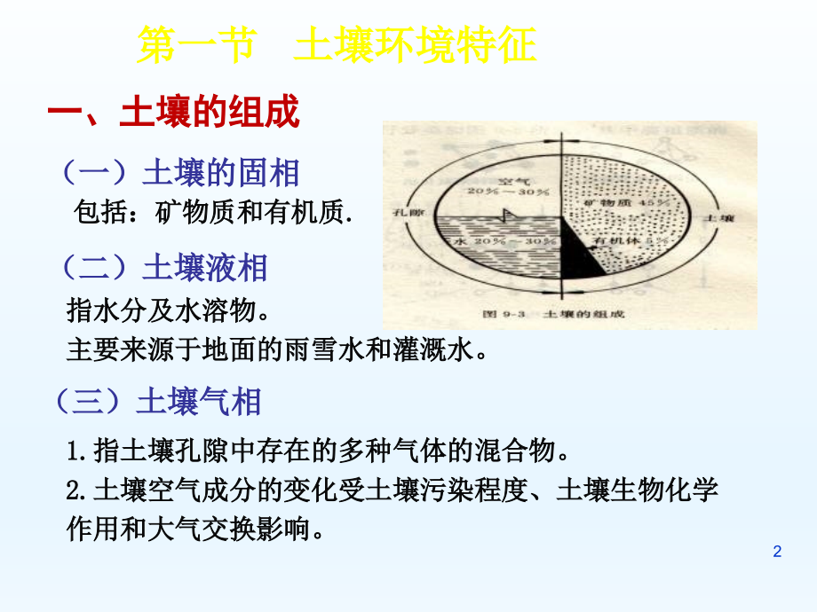 单击此处编辑母版标题样式,单击此处编辑母版文本样式,第二级,第三级,第四级,第五级,*,第六章 土壤卫生,1,第一节 土壤环境特征,一、土壤的组成,(一)土壤的固相,包括:矿物质和有机质,.,(二)土壤液相,指水分及水溶物。,主要来源于地面的雨雪水和灌溉水。,(三)土壤气相,1.,指土壤孔隙中存在的多种气体的混合物。,2.,土壤空气成分的变化受土壤污染程度、土壤生物化学作用和大气交换影响。,2,土壤质地,是按土壤粒级及其组合比例而定的土壤名称,反映了土壤固相颗粒系列分布情况。,根据土壤质地分为砂土、壤土和粘土。,二、土壤的物理学特征:,各种矿物质颗粒按大小和性质的不同进行分组,划成若干等级,称为土壤的,粒级,。,(一)土壤质地,3,土壤容水量,容水量大不利于建筑防潮和有机物的无机化。,土壤渗水性,土壤颗粒越大,渗水越快,不利于地下水的防护。,土壤的毛细管作用,孔隙越小其毛细管作用越大。容易造成建筑物地面及墙壁的潮湿。,(二)土壤的孔隙度,在自然状态下,单位容积土壤中孔隙容积所占的百分率,称为土壤孔隙度。,4,土壤化学元素与成土母岩成分有关。,沉积岩,-,含有各种微量元素,火成岩,-,缺乏某些必需的微量元素。,各地区土壤中各种化学元素的背景值及其环境容量与居民健康之间有着密切关系。,1.,土壤环境,背景值,(,background value),是指该地区未受或少受人类活动(特别是人为污染)影响的土壤环境本身的各种化学元素组成及其含量。,2.,土壤背景值的实践意义。,三、土壤的化学特征,5,土壤环境容量,:是指一定土壤环境单元在一定时限内遵循环境质量标准,即维持土壤生态系统的正常结构与功能,保证农产品的生物学产量与质量,在不使环境系统污染的前提下,土壤环境所能容纳污染物的最大负荷量。,土壤细菌,土壤藻类,土壤原生动物,四、土壤的生物学特征,6,土壤污染:指在人类生产和生活活动中排出的有害物质进入土壤中,超过一定限量,直接或间接地危害人畜健康的现象。,第二节 土壤的污染、自净及污染物的转归,一、土壤的污染,1,、隐蔽性,2,、累积性,3,、不可逆转性,4,、长期性,(一)土壤污染的基本特点,7,农药:,化肥:,农用化学品:,农用地膜,农药,农用地膜,(二)土壤污染的来源,1.,农业污染,8,废气,废水,废渣,2.,工业污染:,工业,“,三废,”,9,3.,生活污染,10,4.,交通污染,11,火山爆发,地震引发核泄漏,切尔诺贝利核泄漏事件,5.,灾害污染,6.,电子垃圾污染,12,污染物污染土壤的方式,受大气污染源性质的影响,进水口附近土壤中的浓度高于出水口处,污染范围较局限固定,可通过风吹雨淋污染土壤和水体,对一些污染物不易自净。,1.,气型污染,2.,水型污染,3.,固体废弃物型污染,13,二、土壤的净化作用,土壤自净作用,:受污染的土壤通过物理、化学和生物学的作用,使病原体死灭,各种有害物质转化到无害的程度,土壤可逐渐恢复到污染前的状态。,机械阻留、稀释、吸附、挥发、迁移,氧化还原反应、络合,-,螯合反应、酸碱中和反应、水解、光化学作用降解,2.,化学净化,1.,物理净化,14,(,1),病原体的死灭,日照、不适宜的生存条件,微生物拮抗作用、杀菌素等,(,2),有机物的净化,有机物污染物 微生物 无机化或腐殖质化,含氮有机物的净化:,氨化作用:含氮有机物简单含氮化合物氨,硝化作用:氨亚硝酸硝酸(有氧条件),反硝化作用:硝酸亚硝酸氨(厌氧条件),病原体死亡,3.,生物净化,15,迁移,扩散,降解,转化,残留,三、污染物的转归,16,降 解,光化学降解,化学降解,生物降解,吸 附,挥发,扩散,迁移,物 理 转 化,(一)化学农药在土壤中的迁移转化,17,1,、土壤对农药的吸附,2,、化学农药在土壤中的挥发、扩散和迁移,3,、农药在土壤中的降解过程,光化学降解:太阳辐射和紫外线能量的作用,化学降解:水解和氧化作用,生物降解:微生物对农药的生物化学作用,(一)化学农药在土壤中的迁移转化,18,土壤胶体、腐殖质的吸附和螯合作用,土壤,pH,低,,金属溶解度高,,更易被植物吸收,或迁移;调节土壤的,pH,值。,土壤处于,还原,状态时,重金属易形成,不溶性硫化物,;但砷特殊,还原状态时的毒性更强。,(二)重金属元素在土壤中的转化,19,(三)重金属和农药的残留,重金属:长期以不同形式存在于土壤中,也可经植物吸收和富集,水溶性农药:迁移、扩散到周围水体,脂溶性农药:易被土壤吸附,经植物吸收和富集,引起食物链高位生物的慢性危害。,20,一、重金属污染的危害,二、农药污染的危害,三、持久性有机污染物的危害,土壤卫生,第三节 土壤污染对健康的影响,四、生物性污染的危害,21,目前我国受镉、砷、铬、铅等重金属污染的耕地积近,2000,万公顷,约占总耕地面积的,1/5,;其中业,“,三废,”,污染耕地,1000,万公顷,污水灌溉的农田面积已达,330,多万公顷。,第三节 土壤污染对健康的影响,一、重金属污染的危害,镉污染,-,慢性镉中毒,日本富山县神通川地区的痛痛病。,22,来源:砷铊矿开采、,危害:,1,、铊对植物的毒性,2,、铊对微生物的毒性,3,、铊进入水体和土壤后,经过水生生物、陆地生物的富集作用进入人体:,主要损害神经系统,肝,肾,(一)铊污染,主要表现为,慢性毒作用,:毛发脱落,周围神经损害,视力下降及失明,影响生殖功能,导致染色体畸变,铊中毒致的头发脱落,铊中毒前的朱令,铊中毒后的朱令,铊中毒后的朱令,23,来源:铬矿、金属冶炼、电镀,危害:以三价铬和六价铬存在;,